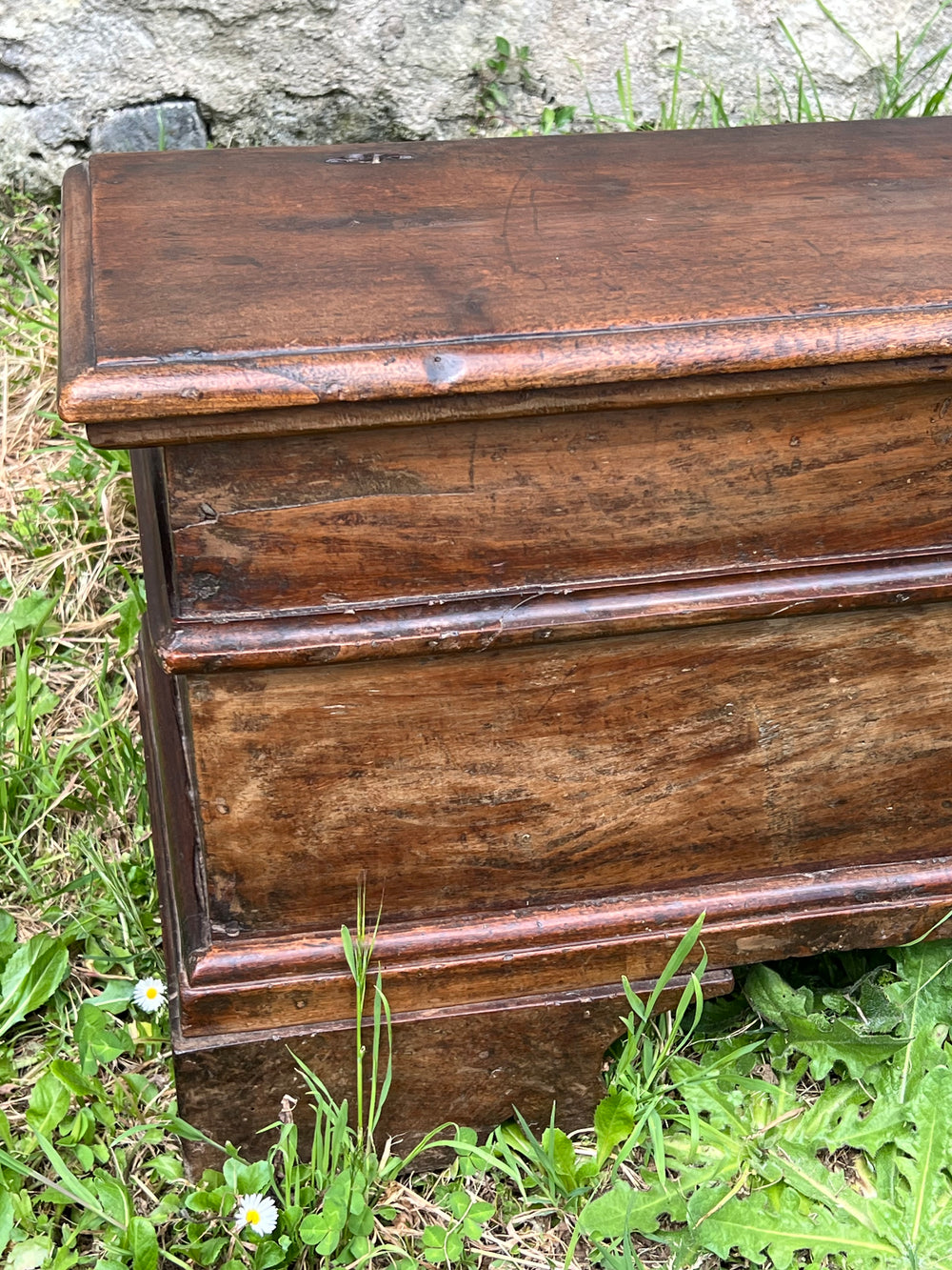 Elegante cassapanca antica in legno massello, risalente ai primi del Novecento. Realizzata con lavorazione artigianale, presenta una struttura solida e sobria, impreziosita da cornici modanate e piedini sagomati.