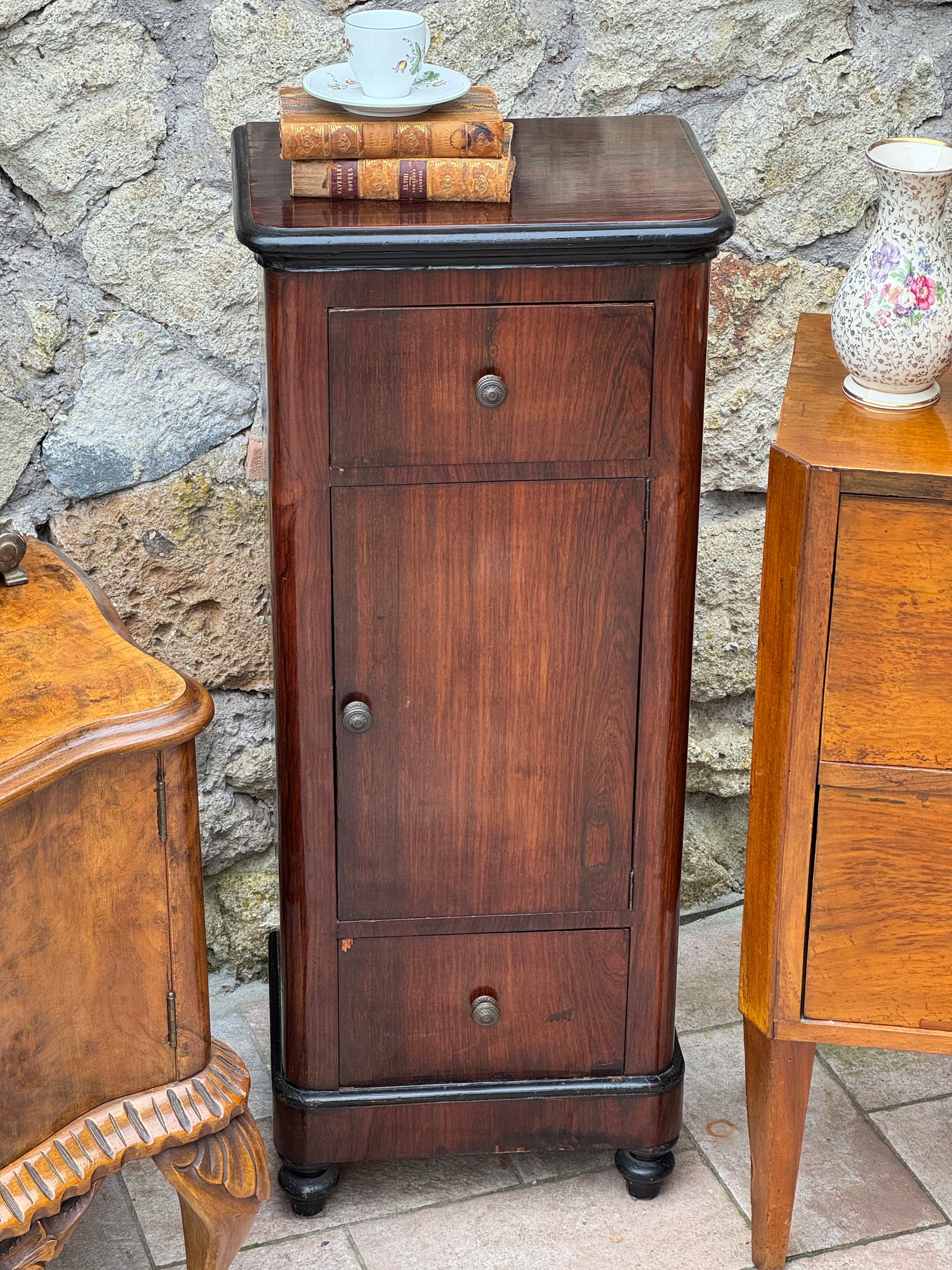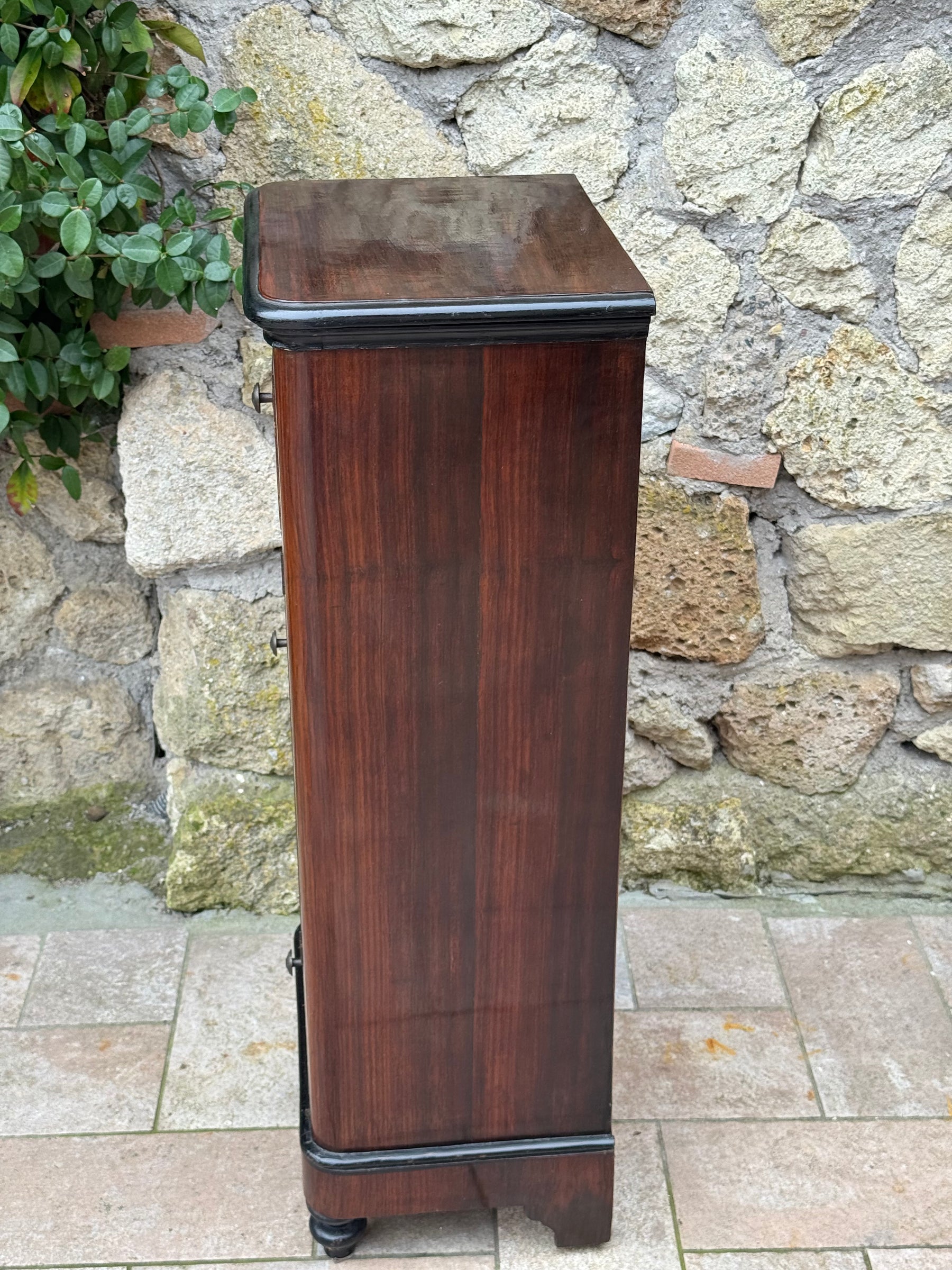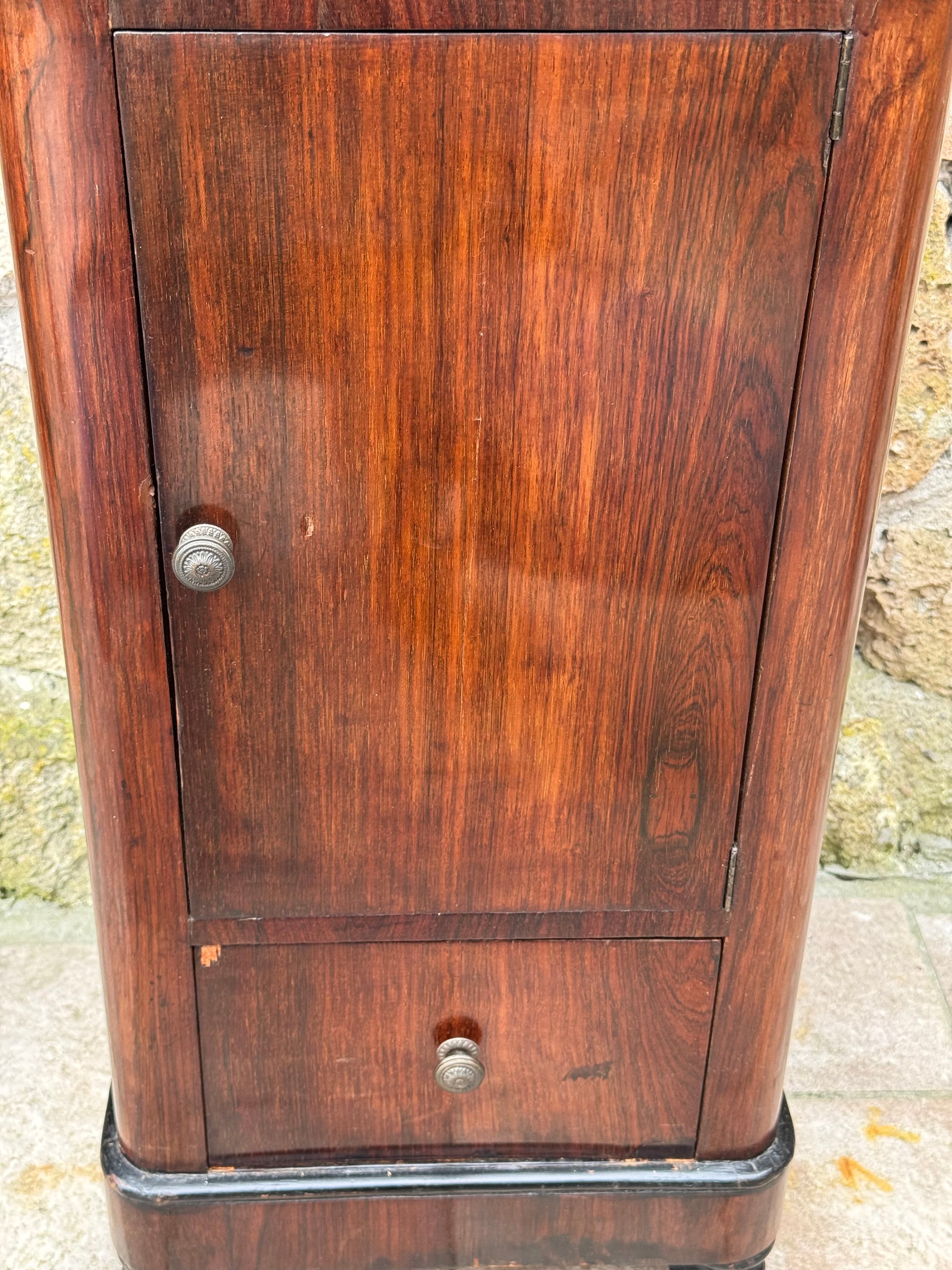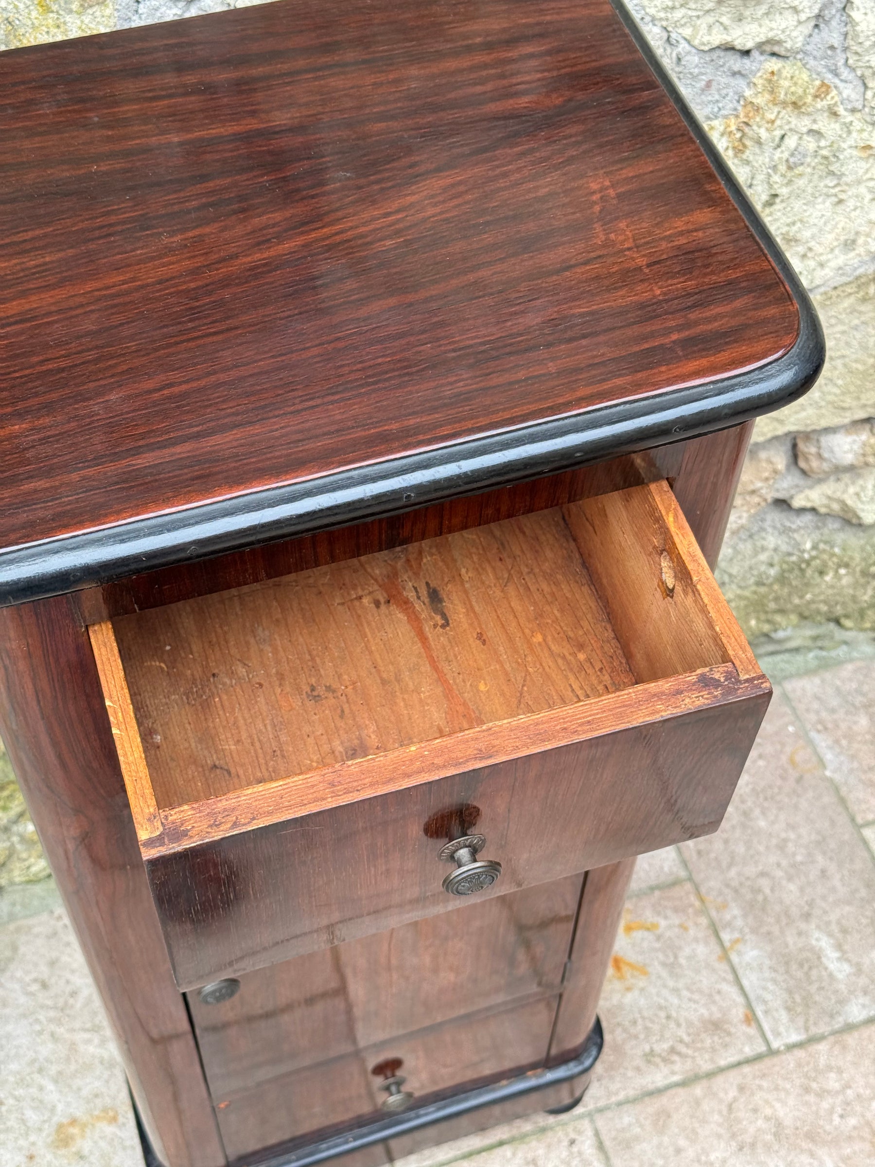 Questo tipo di comodino era molto diffuso nelle camere da letto borghesi tra gli anni Venti e Quaranta, quando il gusto per le linee classiche veniva reinterpretato con forme più compatte ed eleganti.