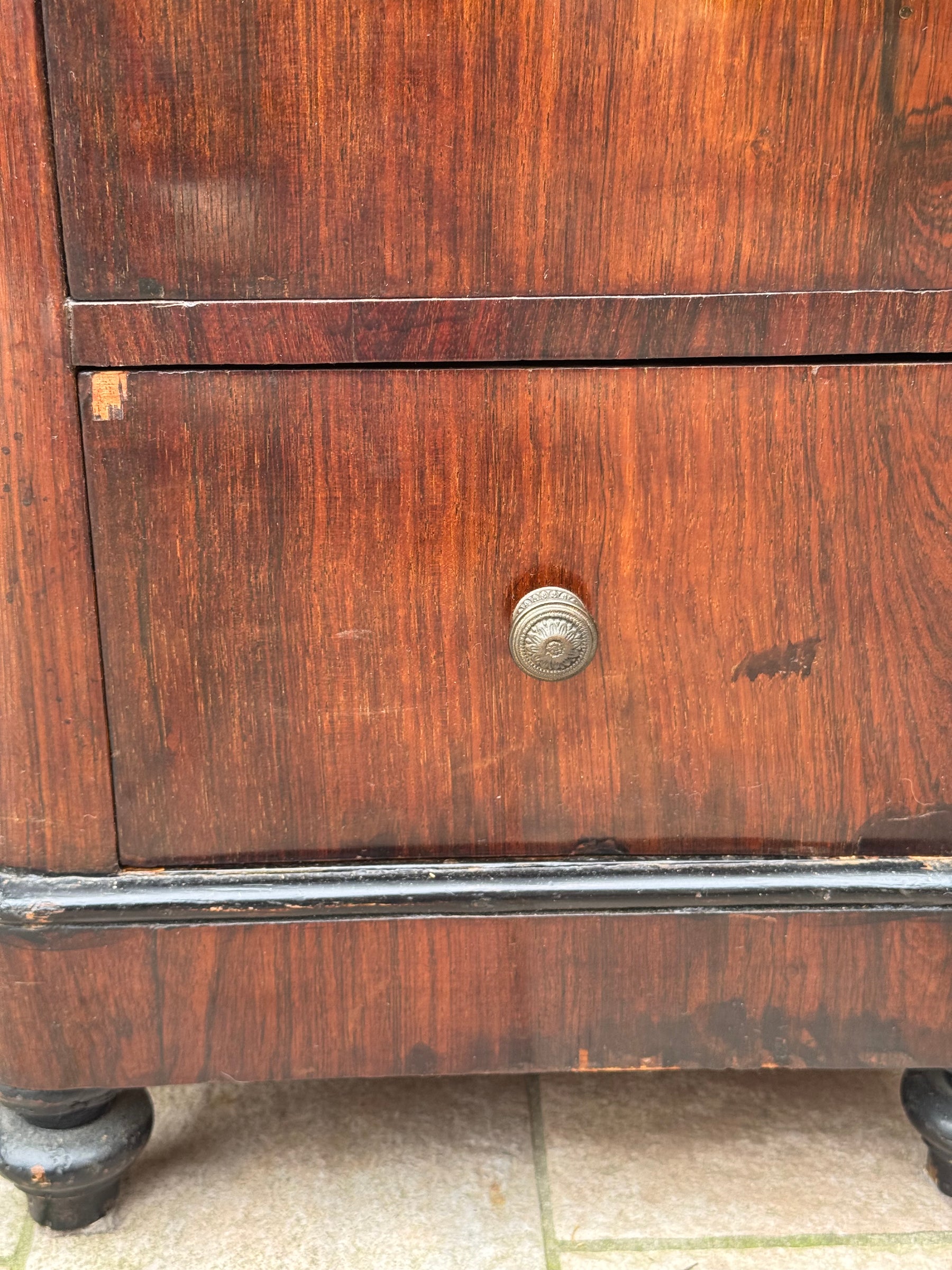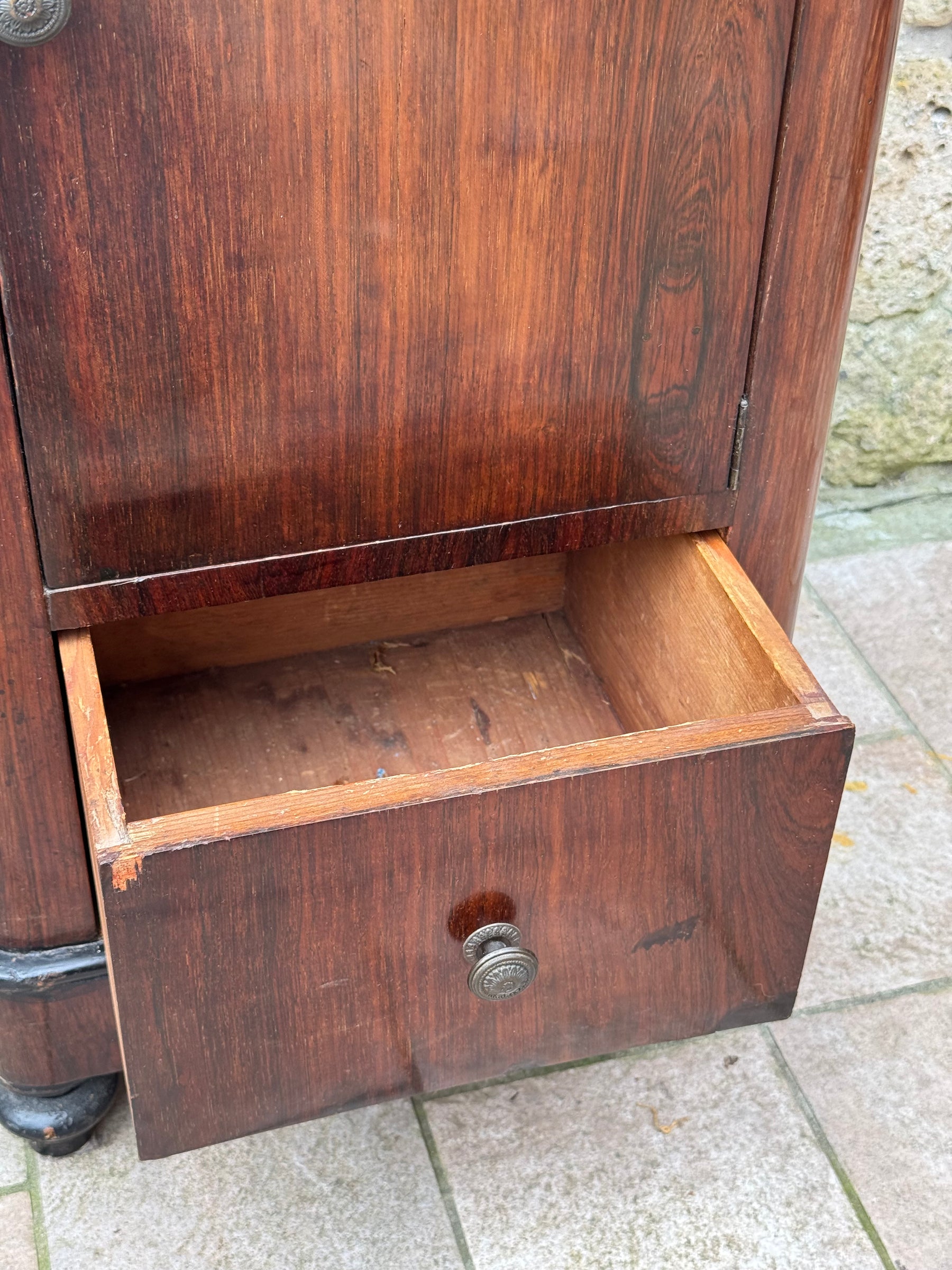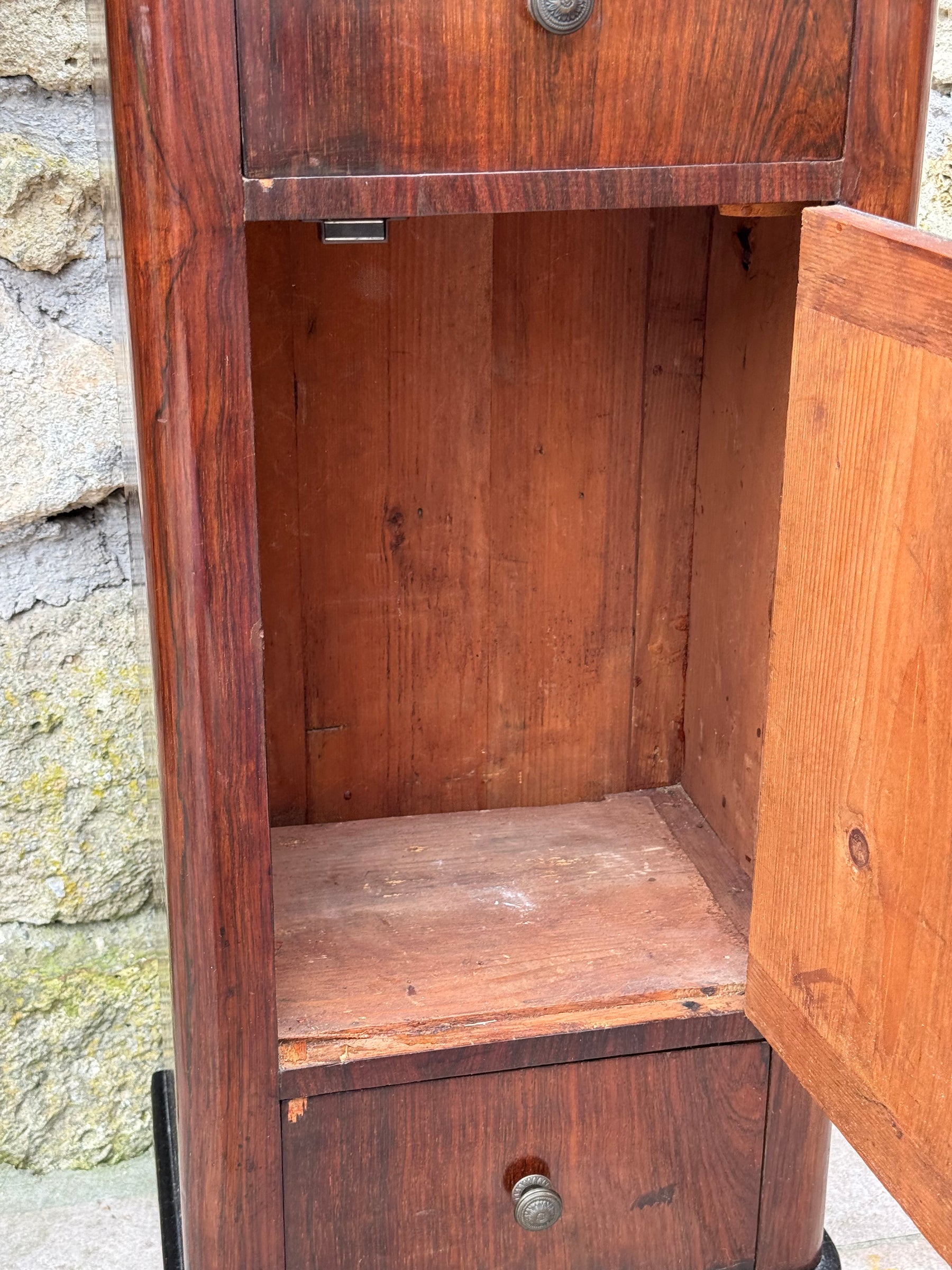 Il mobile presenta cassetto superiore, vano centrale con anta e cassetto inferiore, una configurazione molto funzionale che permetteva di conservare oggetti personali, biancheria o piccoli accessori da camera.