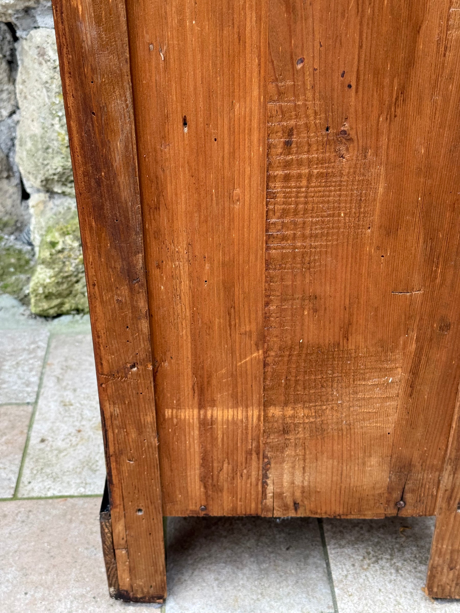 Le venature del legno, valorizzate dalla patina maturata nel tempo, rendono questo comodino un complemento perfetto per ambienti vintage, rustici o eclettici.