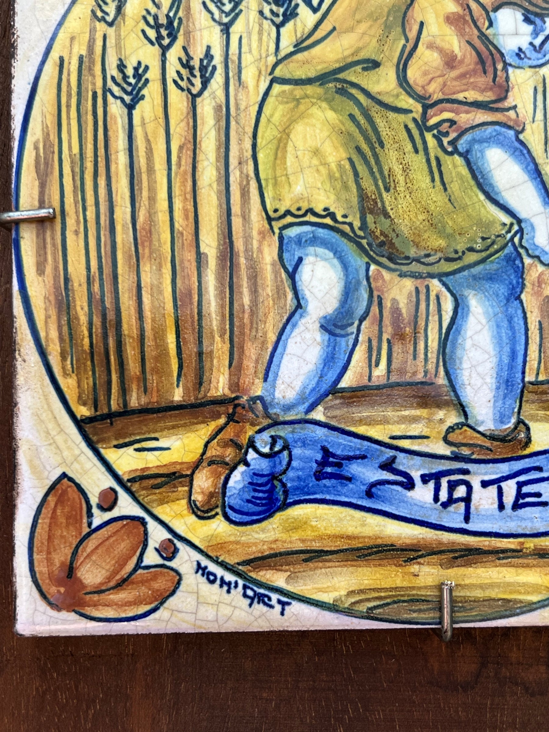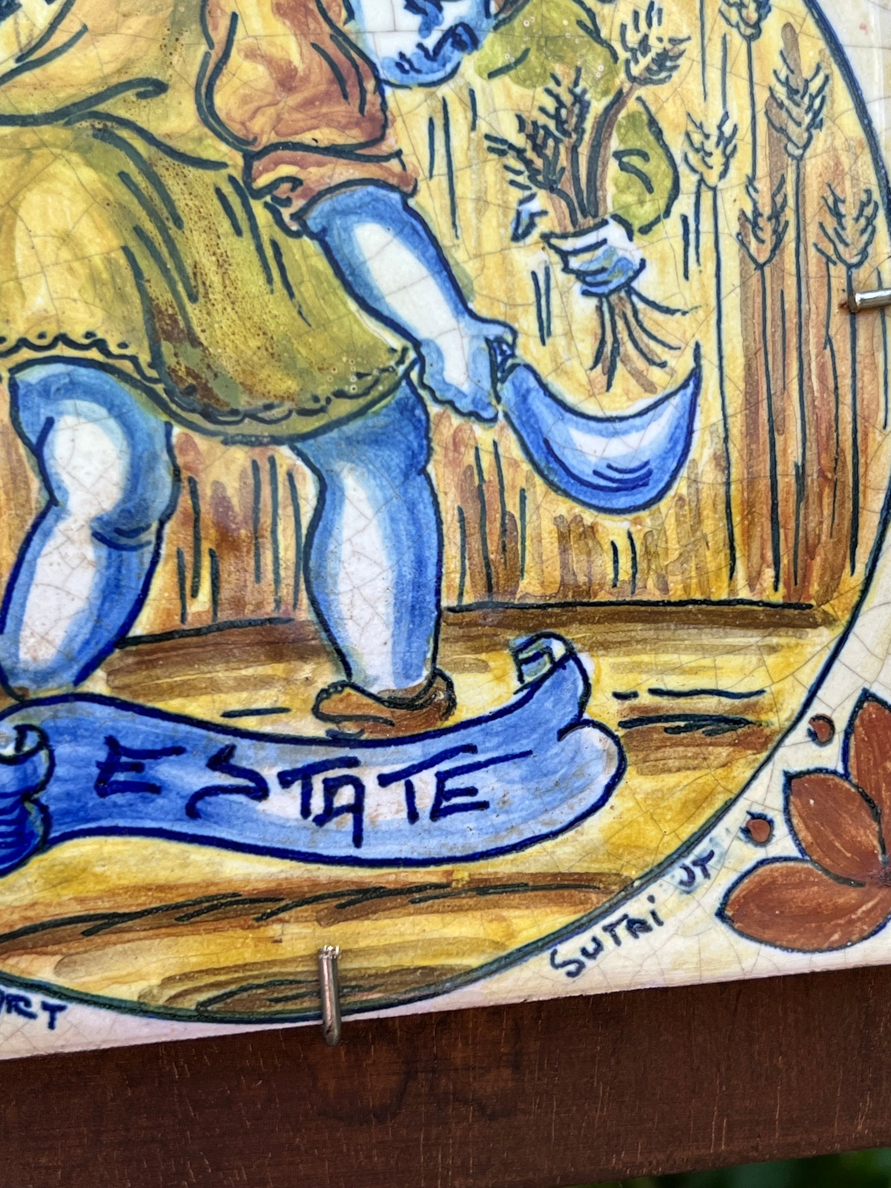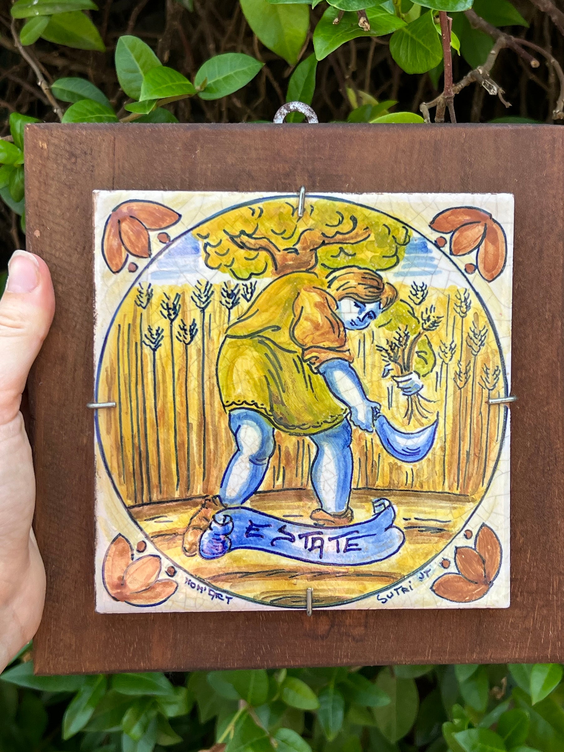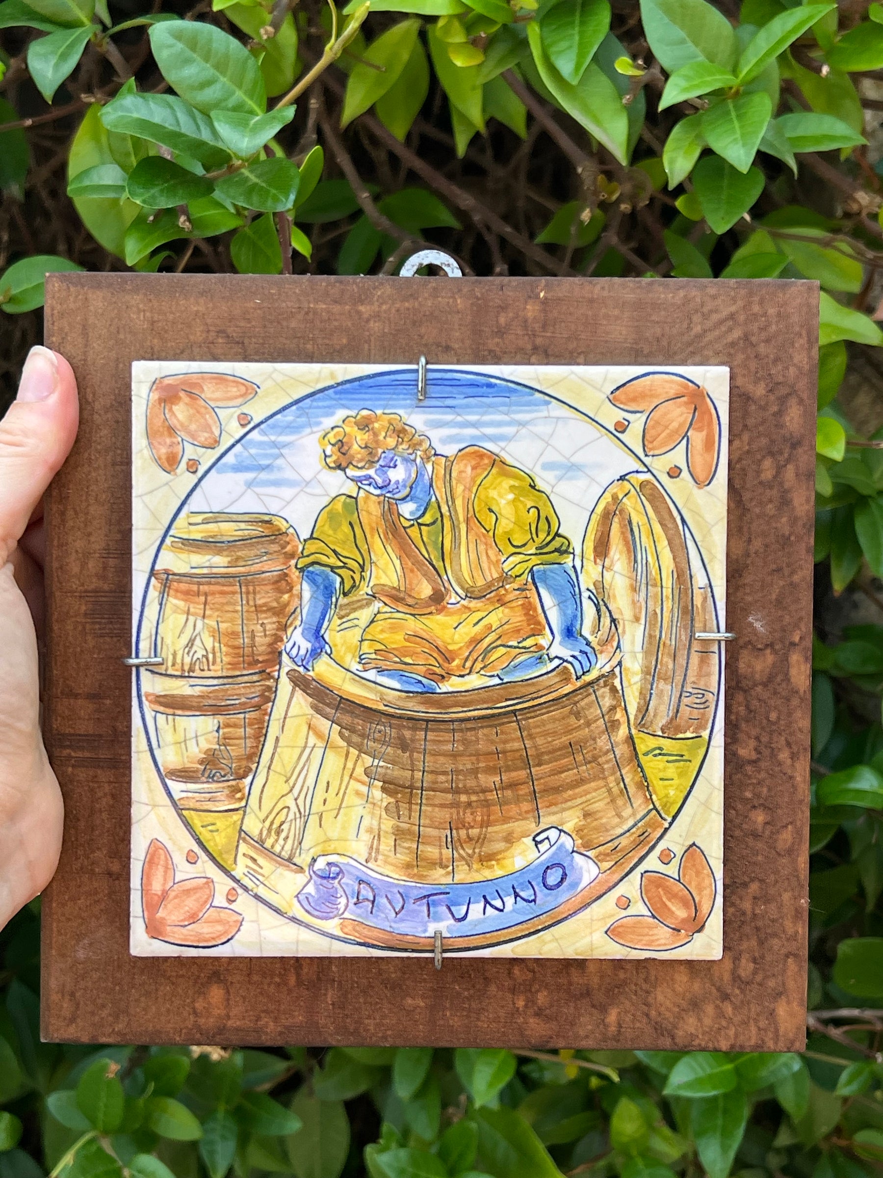 Incantevole set decorativo composto da quattro mattonelle in ceramica dipinte a mano, ciascuna dedicata a una stagione dell’anno: Primavera, Estate, Autunno e Inverno. Ogni mattonella è incorniciata su legno con scene dai colori caldi e vivaci che raffigurano figure contadine impegnate in attività stagionali, rievocando l’iconografia popolare e rurale del centro Italia.