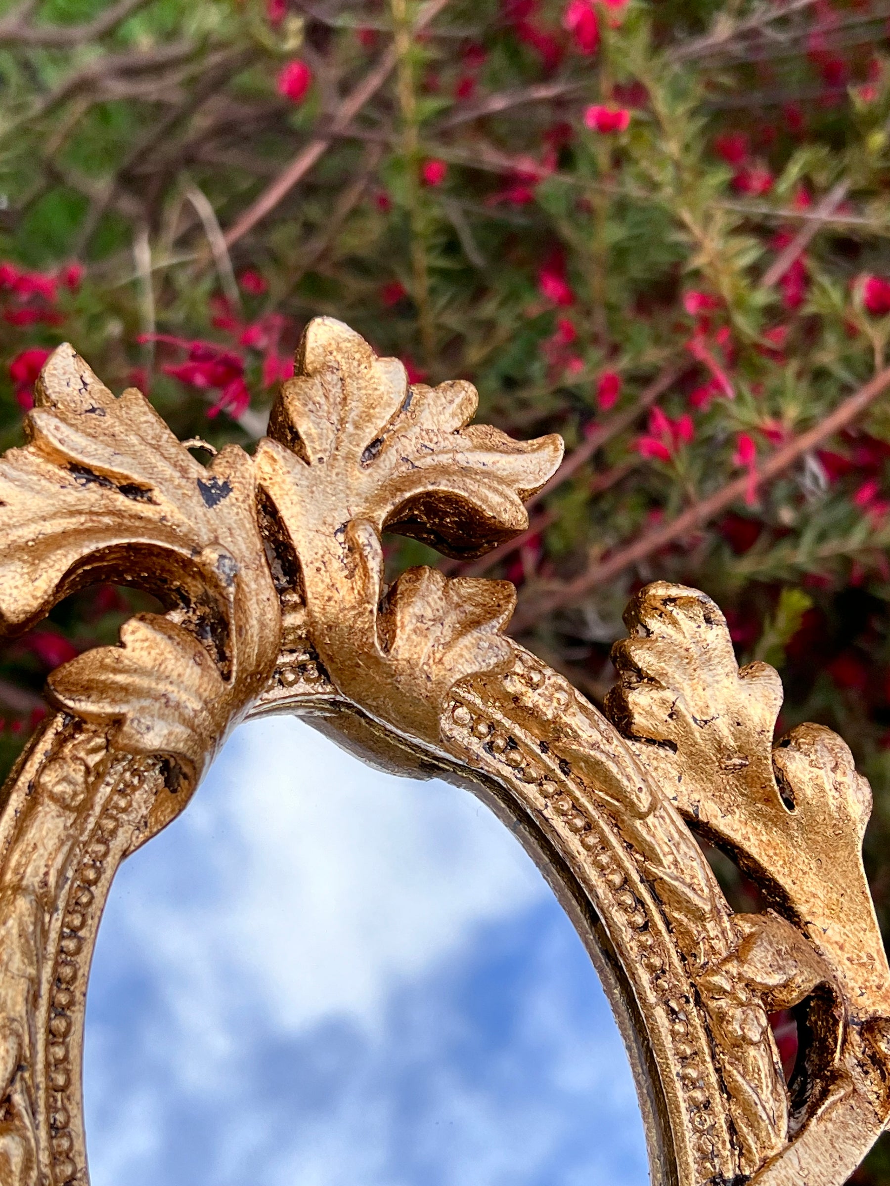 Specchietto di misure 16x21 cm, di ispirazione barocca con cornice intagliata e dorata a foglia oro. Lungo tutta la cornice è presente un elaborato decoro fogliaceo.