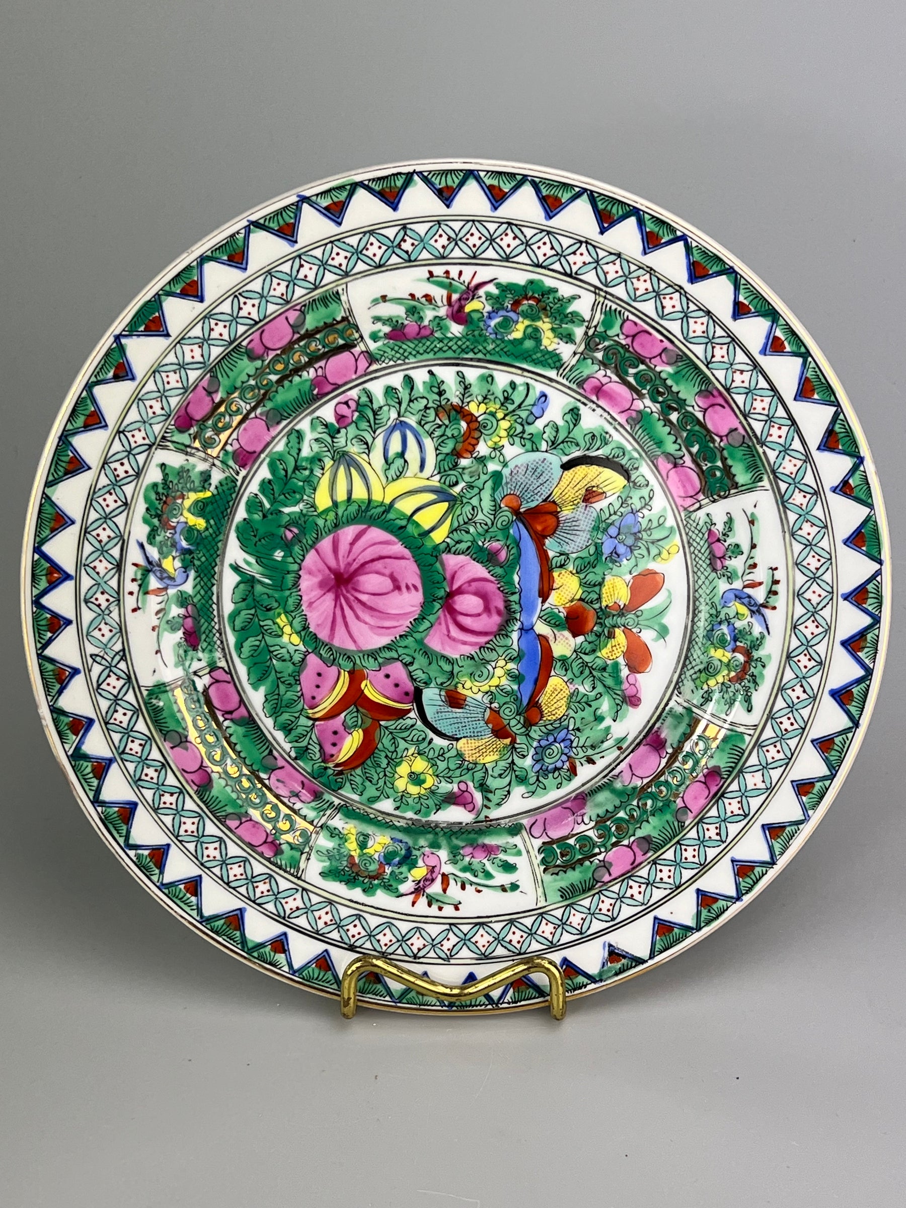 Elegante piatto in porcellana cinese finemente decorato a mano, appartenente alla tradizione stilistica "Famille Rose", caratterizzata da smalti vivaci e motivi floreali e naturalistici. Il piatto presenta una composizione centrale con rose, frutti, uccelli e fiori esotici, il tutto incorniciato da cartigli e bordi geometrici multicolore.