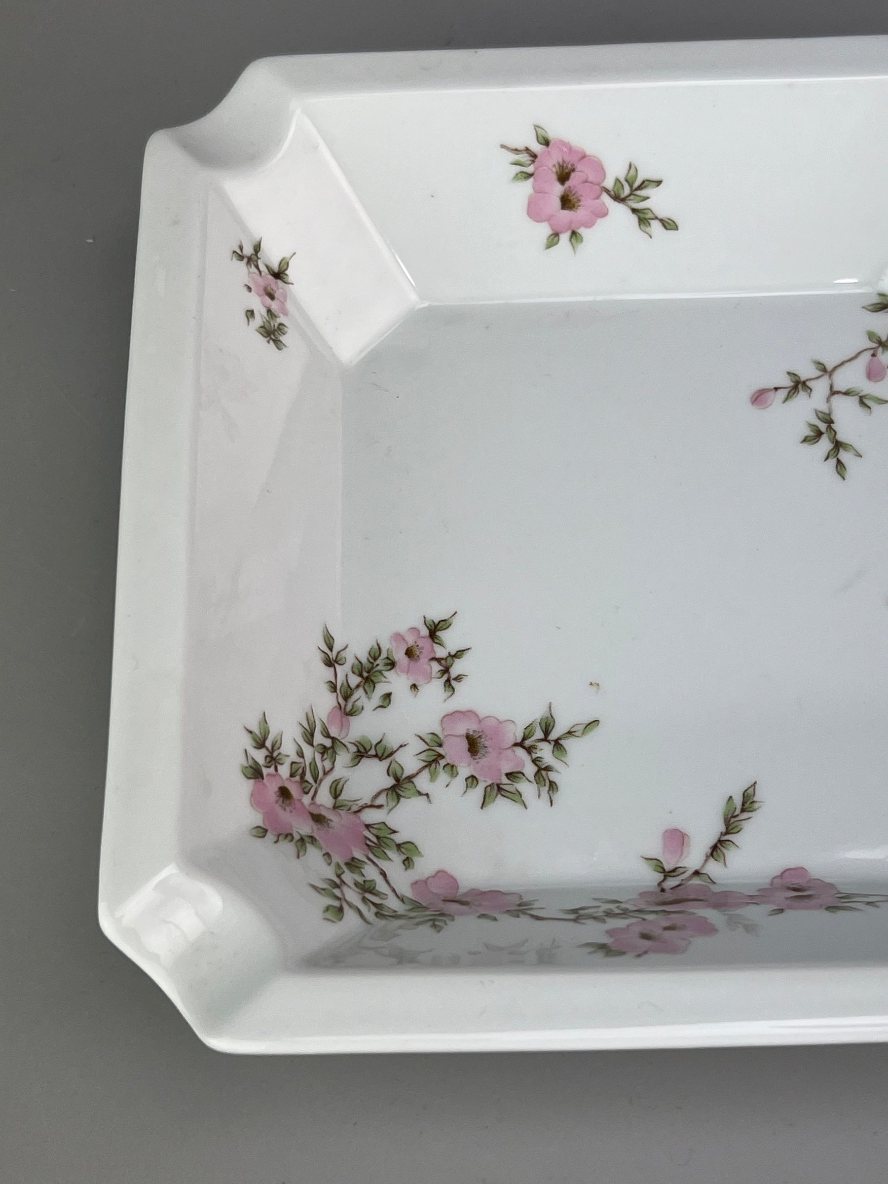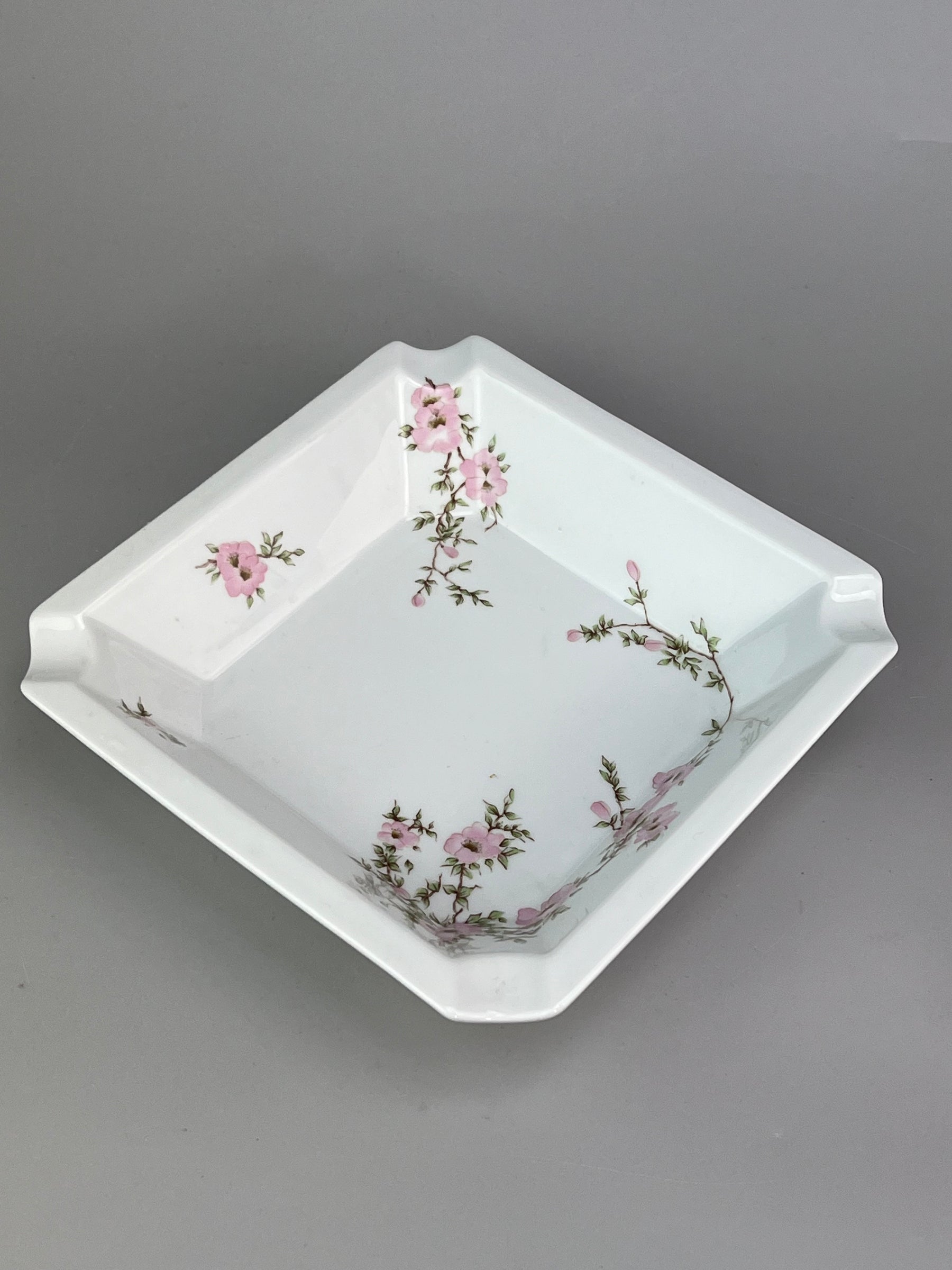 Posacenere quadrato in porcellana Bernardaud Limoges Amandine con fiori rosa su fondo bianco