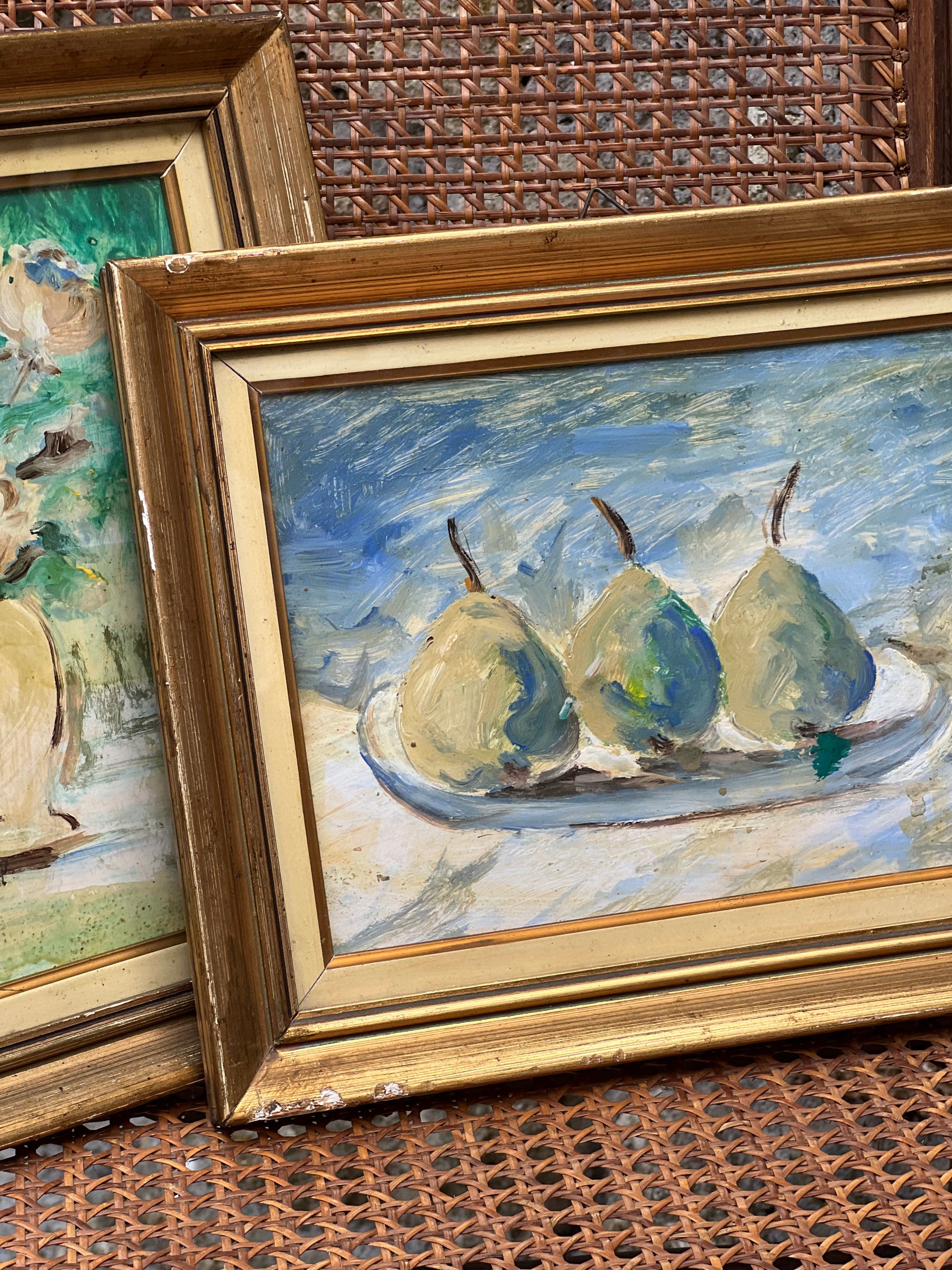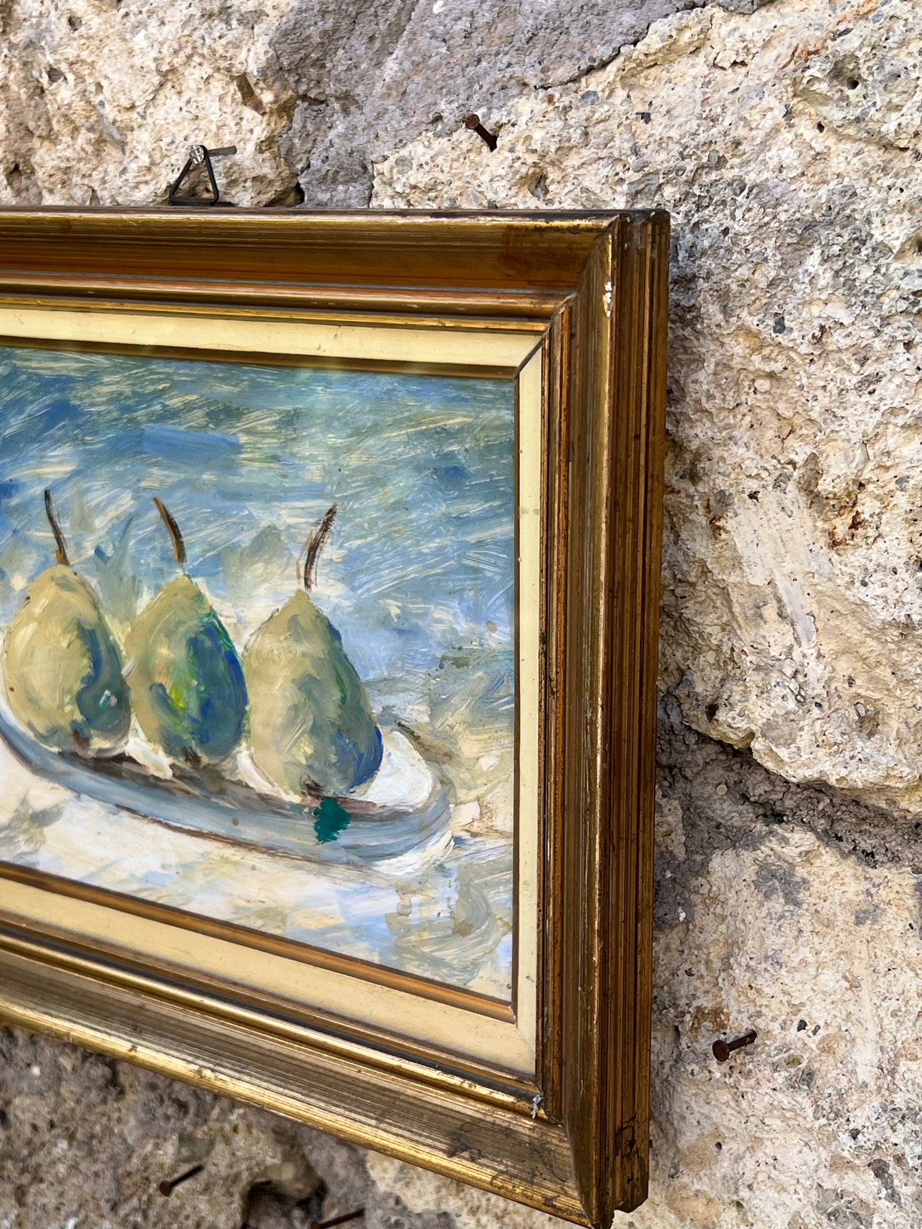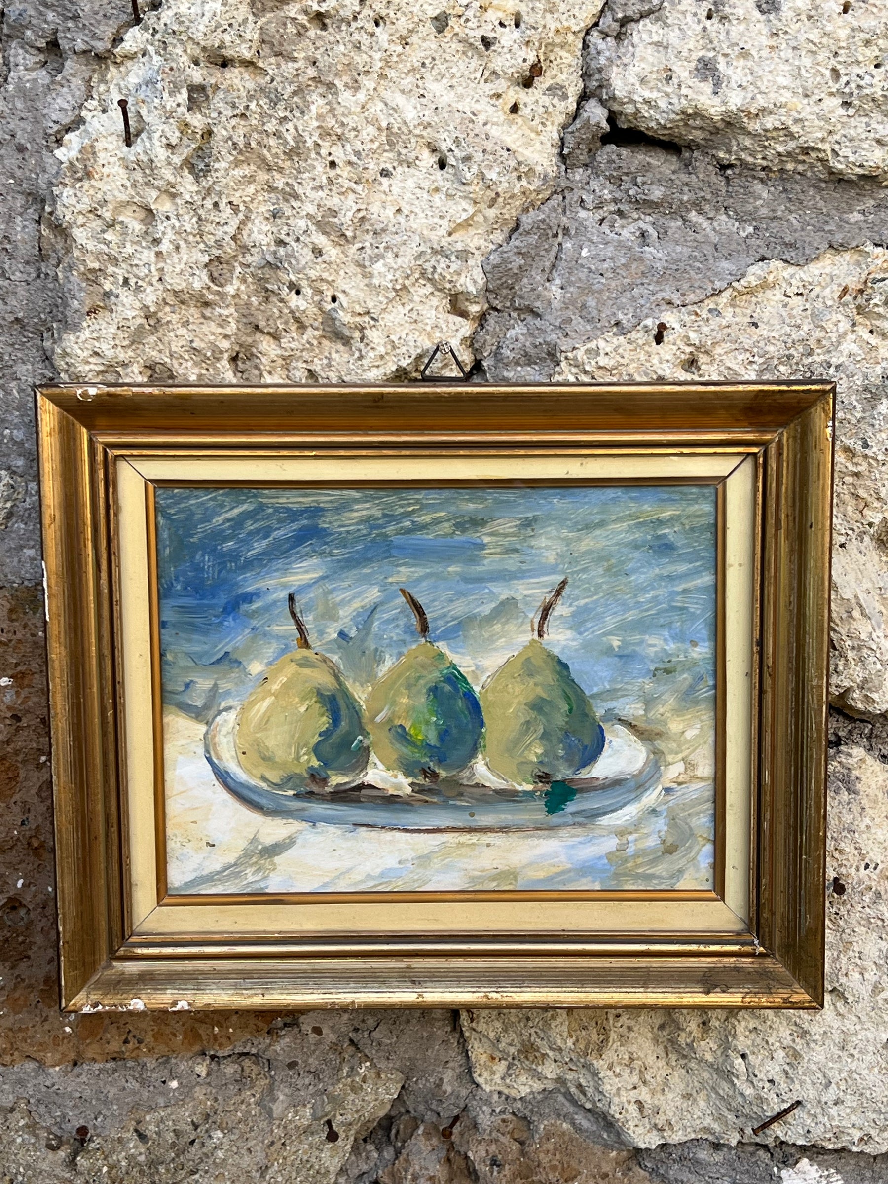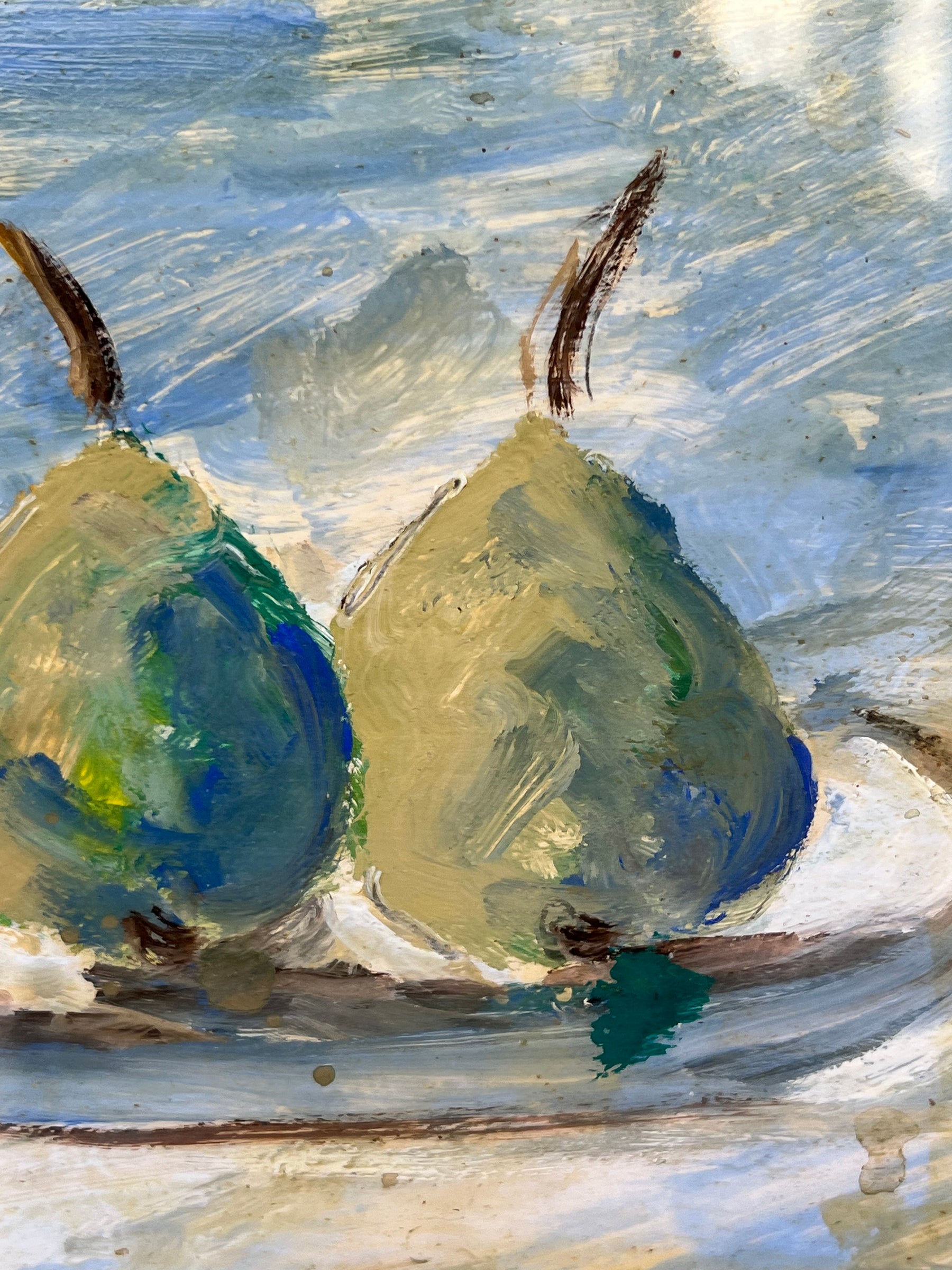 Quadro vintage realizzato a olio su tavola, raffigurante una natura morta con tre pere su piatto bianco, ambientata su uno sfondo dai toni azzurro cielo e pennellate dinamiche. La composizione semplice ma vibrante richiama il gusto per l’essenzialità e la spontaneità del gesto pittorico, con tratti materici che valorizzano forma e colore.