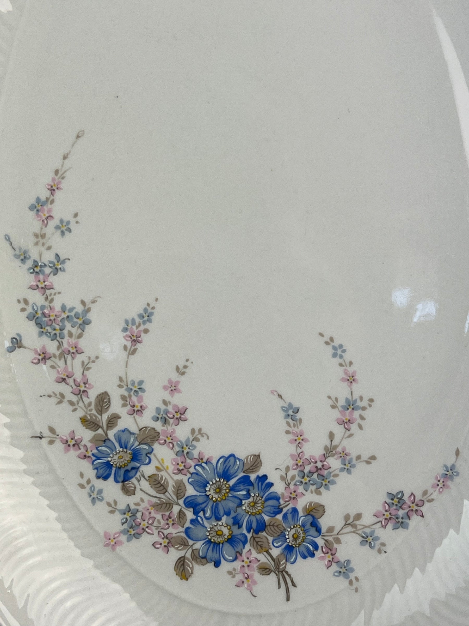 Elegante servizio in porcellana bianca firmato Royal Tognana, decorato con delicati motivi floreali nei toni del blu e rosa e rifinito con sottili profili dorati. Un insieme raffinato e completo, perfetto per apparecchiare con gusto occasioni speciali o arricchire una collezione di porcellane vintage italiane.