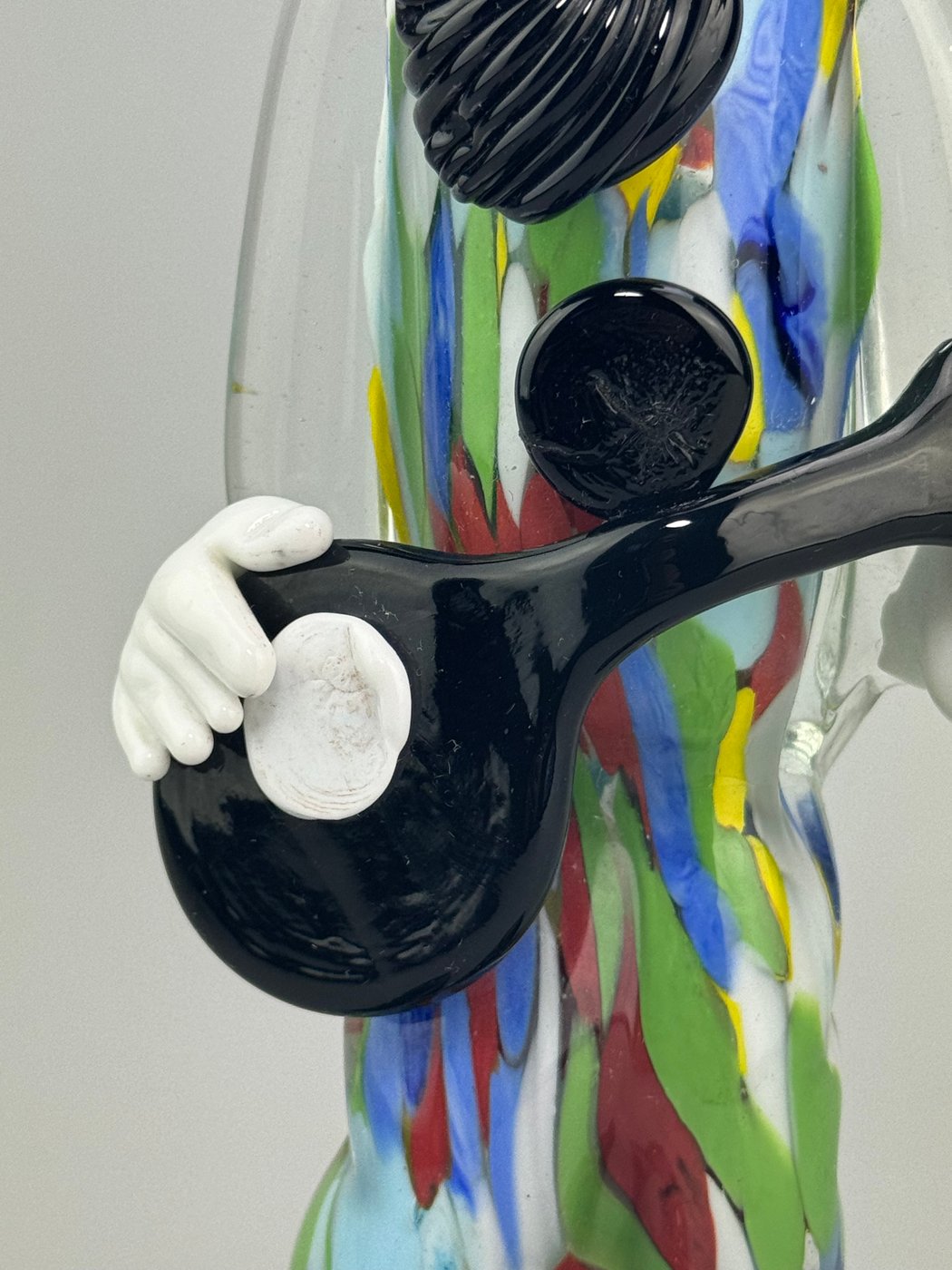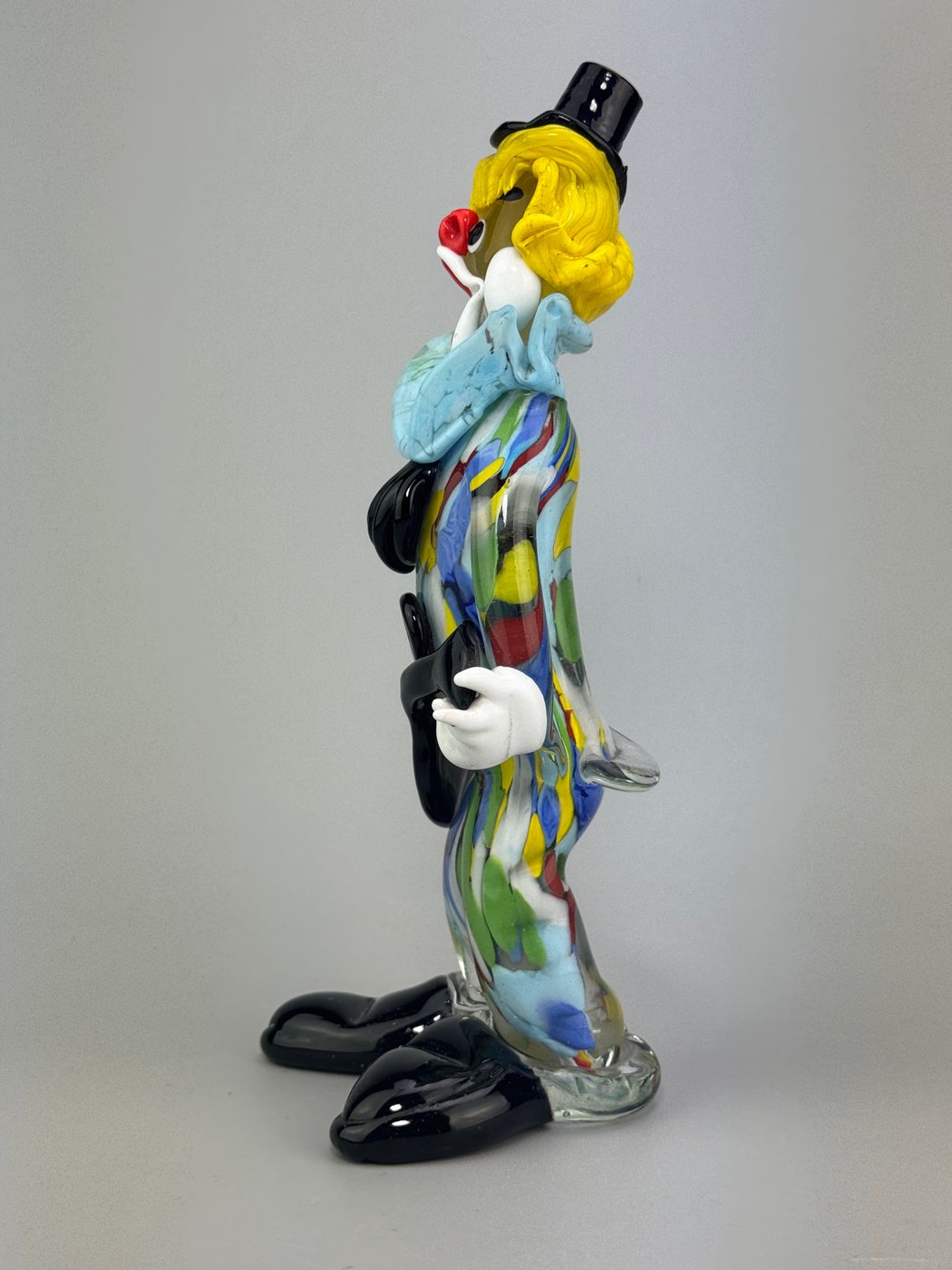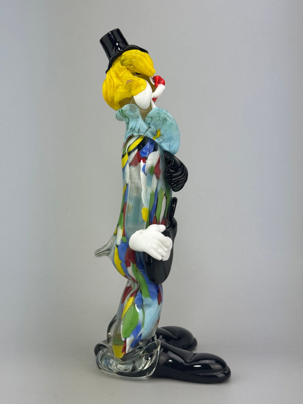 Una figura ironica e teatrale, realizzata in vetro soffiato di Murano, che cattura tutta l’espressività del clown musicale.