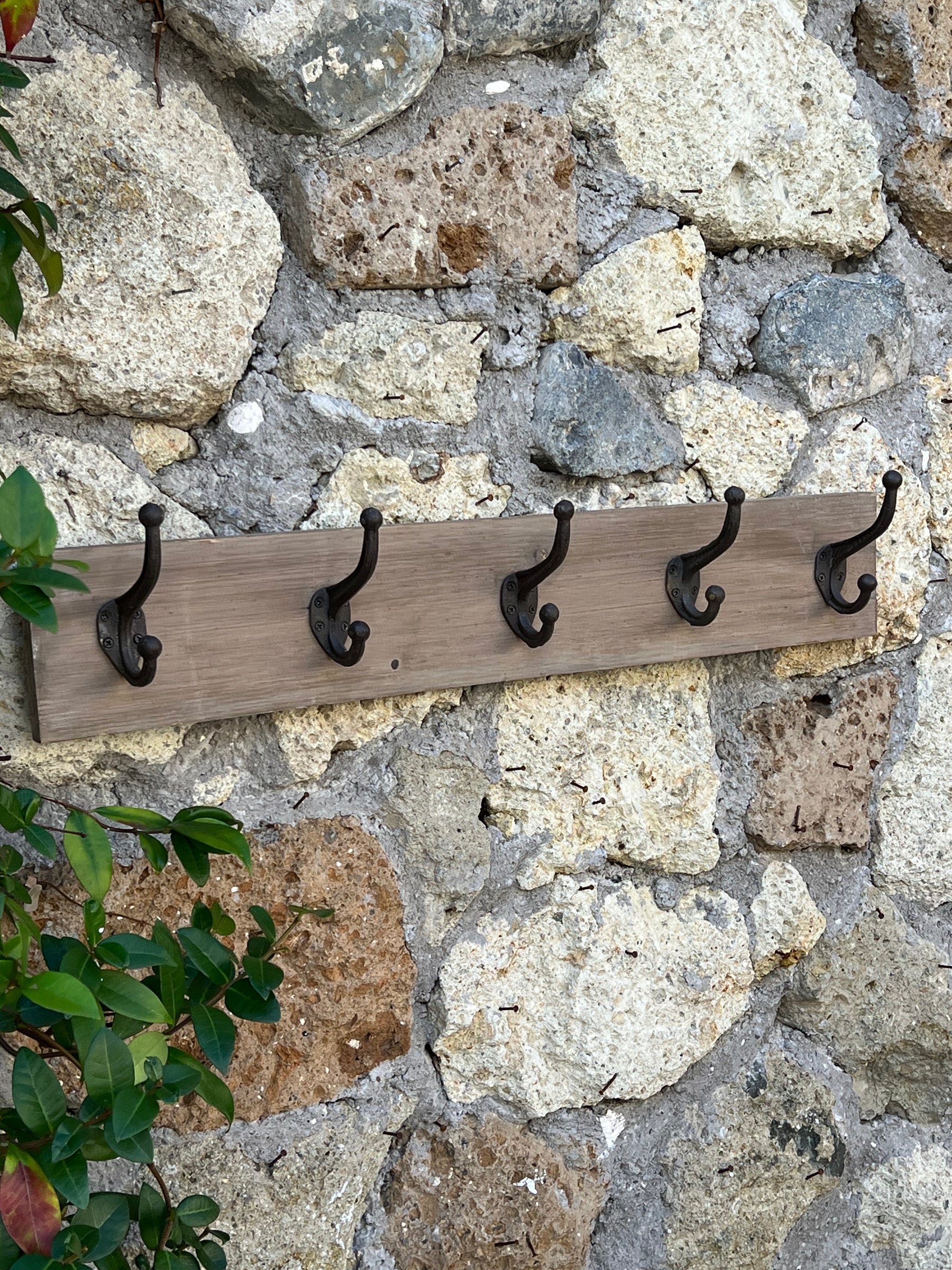 Appendiabiti da parete in legno chiaro con 5 ganci doppi in ferro brunito montato su muro in pietra