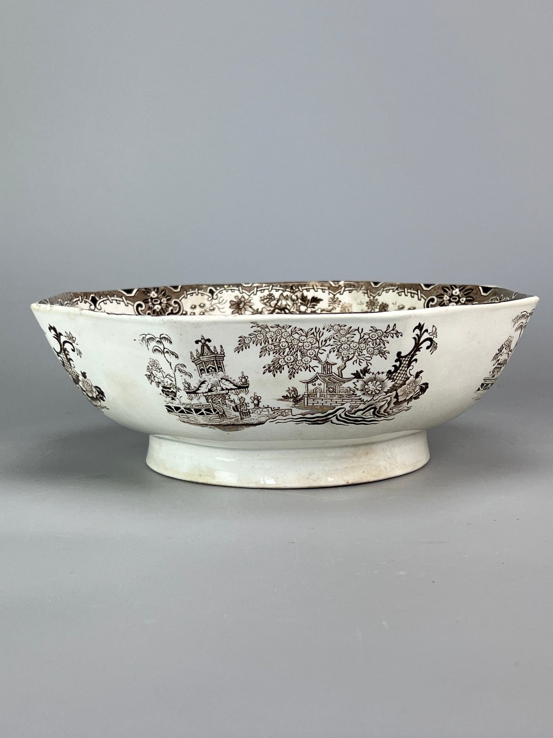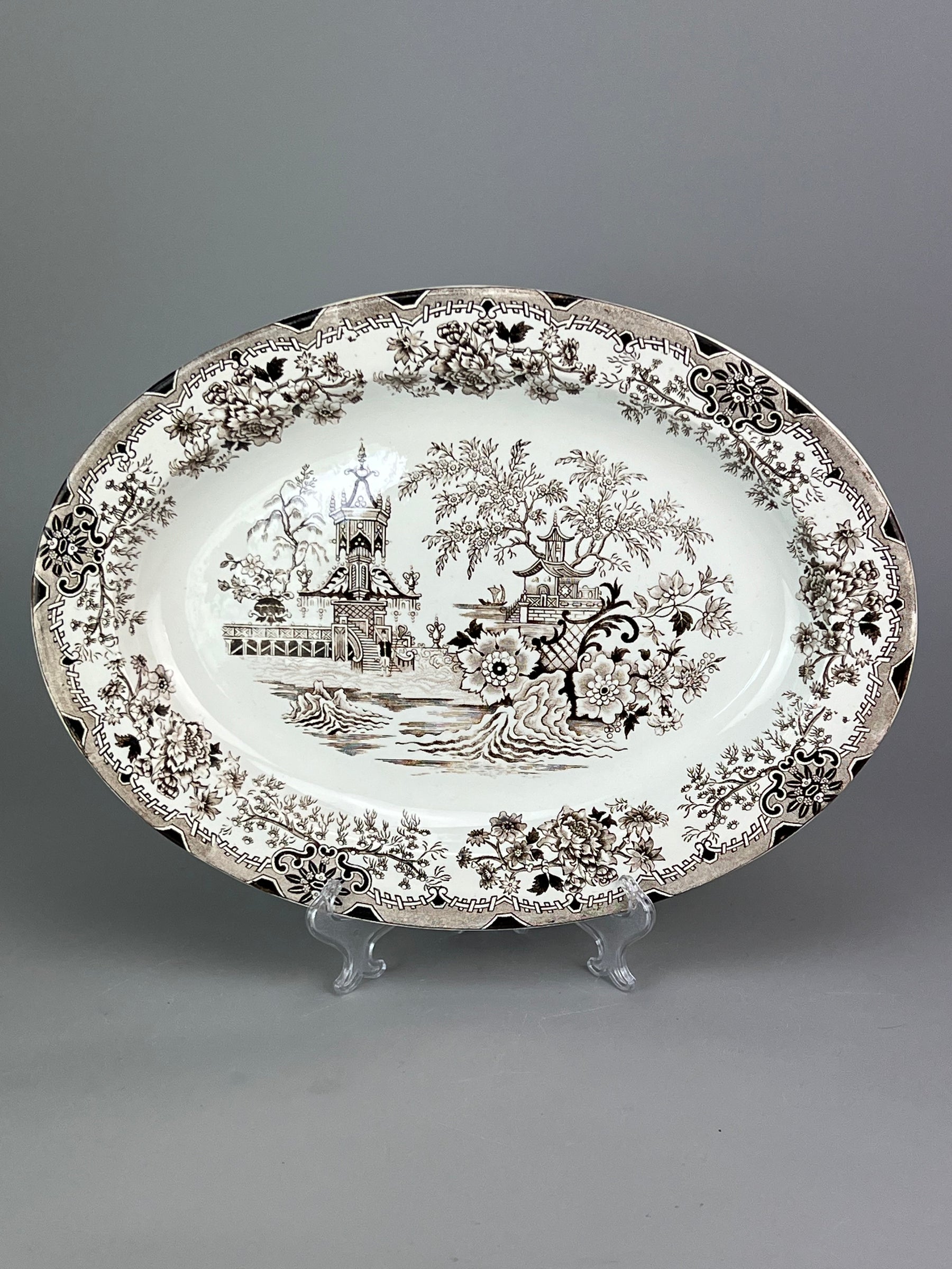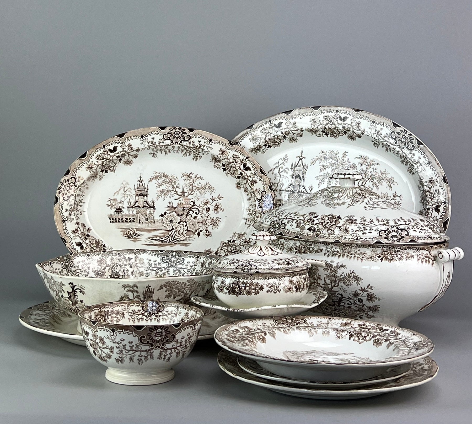 Elegante servizio da tavola per 12 persone firmato SCR, modello “Colandine”, realizzato in pregiata porcellana decorata con paesaggi esotici e motivi floreali in tonalità seppia/marrone. Il decoro tipico in stile Chinoiserie richiama l’estetica delle porcellane inglesi di fine Ottocento, reinterpretate dalla manifattura italiana con grande raffinatezza.