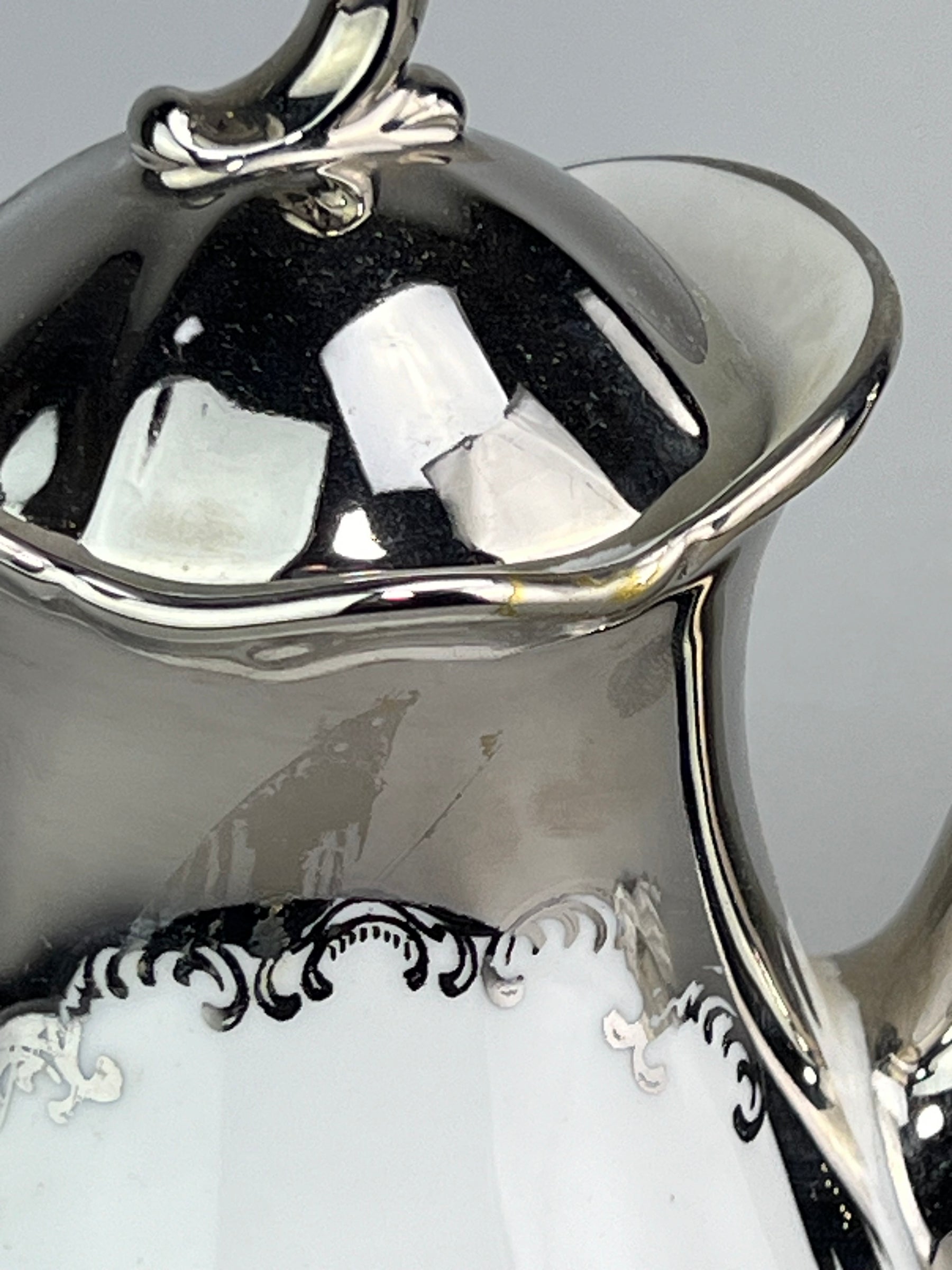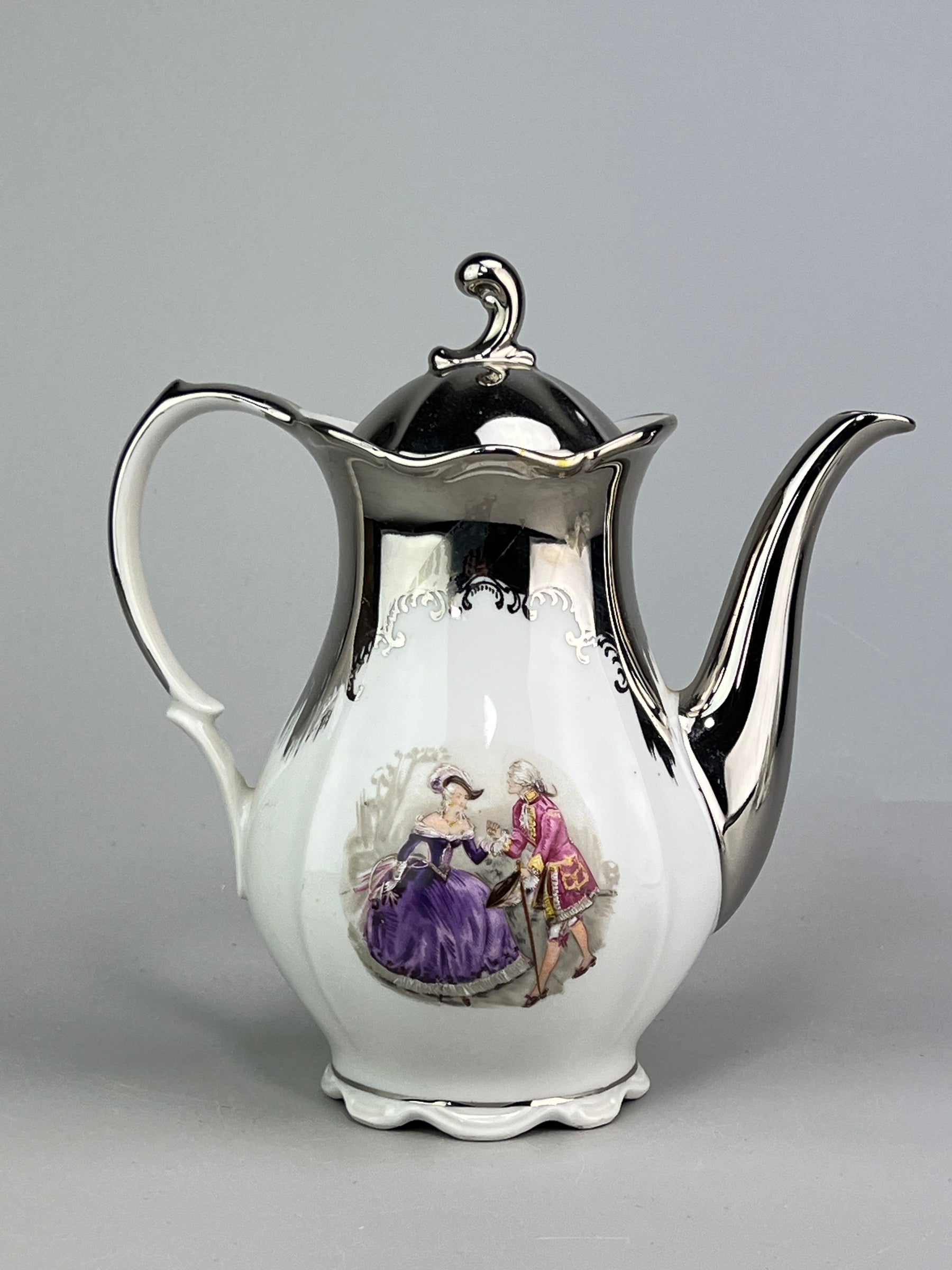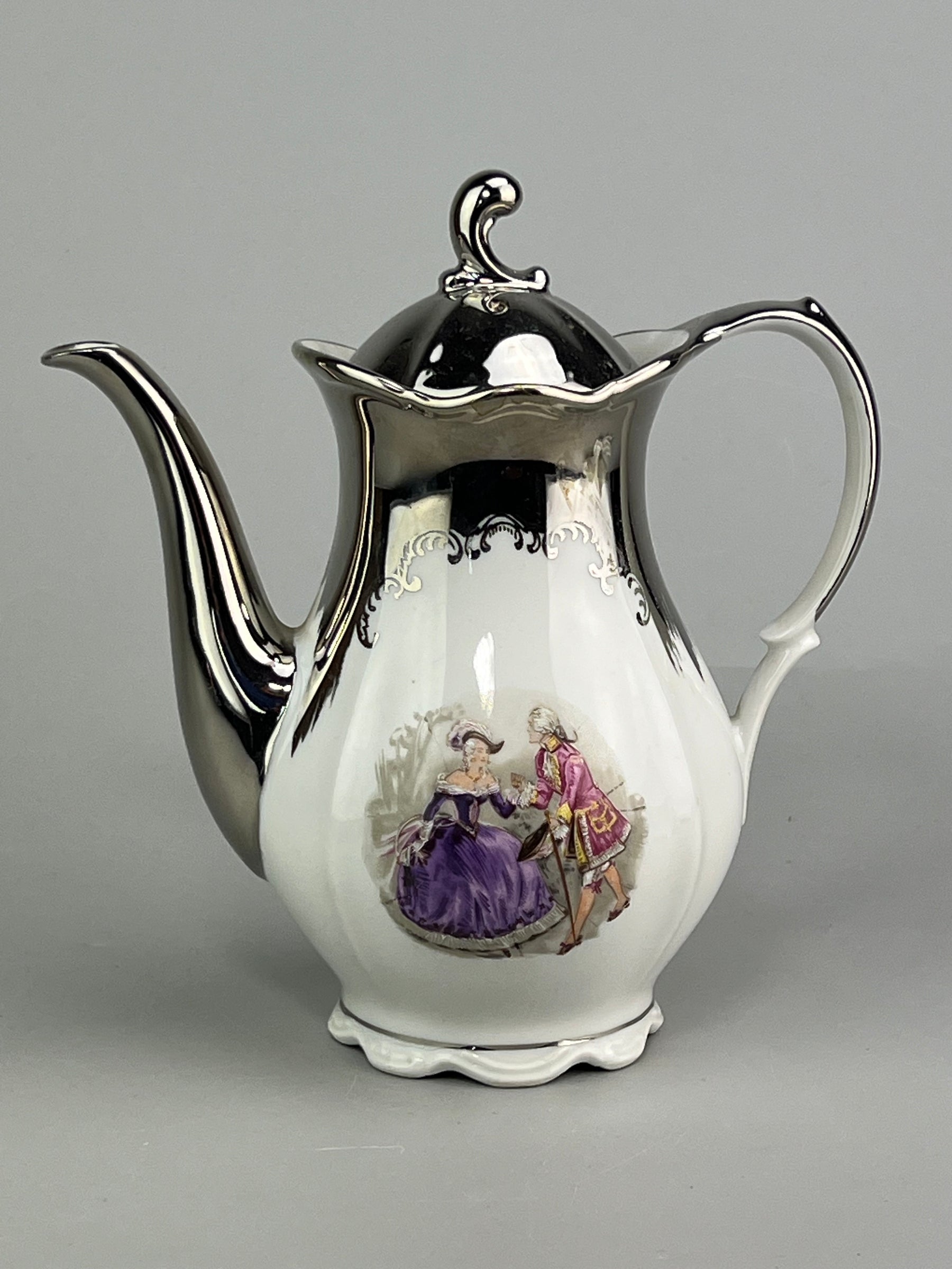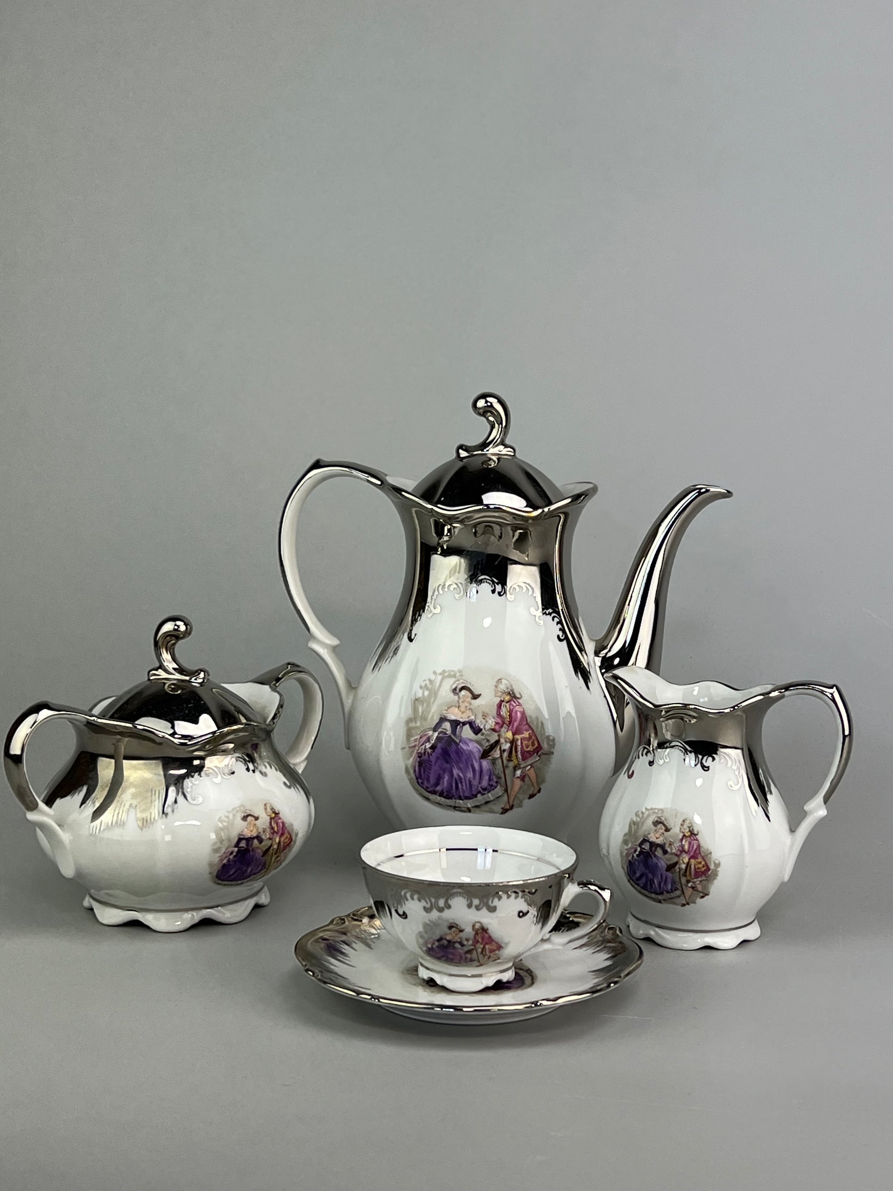 Splendido servizio in porcellana tedesca firmato Bavaria Tirschen, composto da caffettiera, lattiera, zuccheriera e tazzine con piattino per 12 persone. Le forme aggraziate, la decorazione romantica con scene galanti in stile settecentesco e il raffinato bordo argentato rendono questo set un esempio perfetto di eleganza mitteleuropea anni ‘50–‘60.
