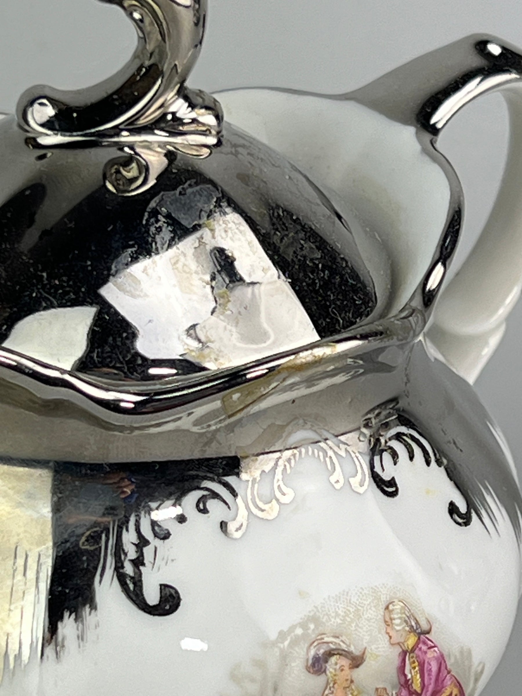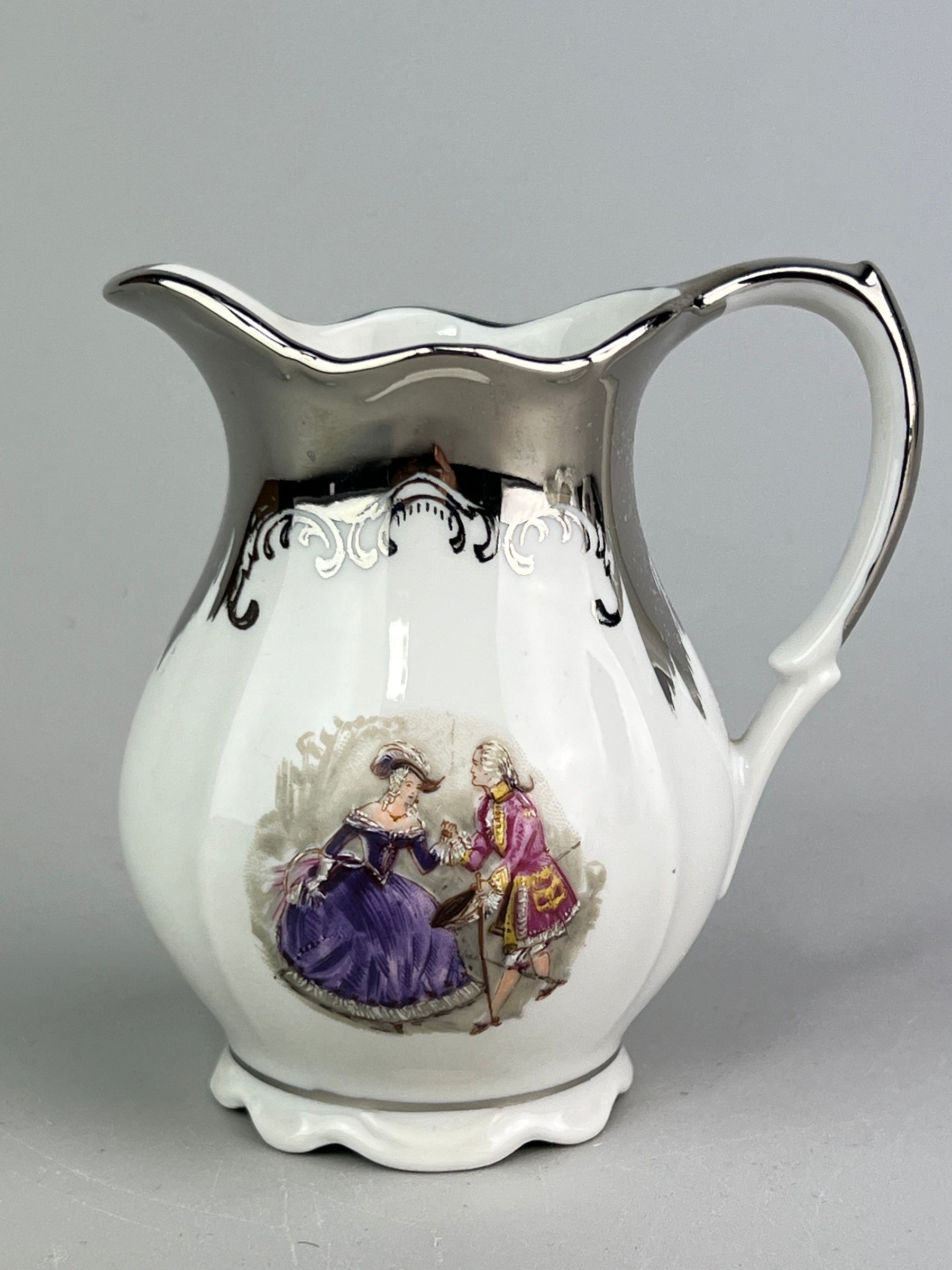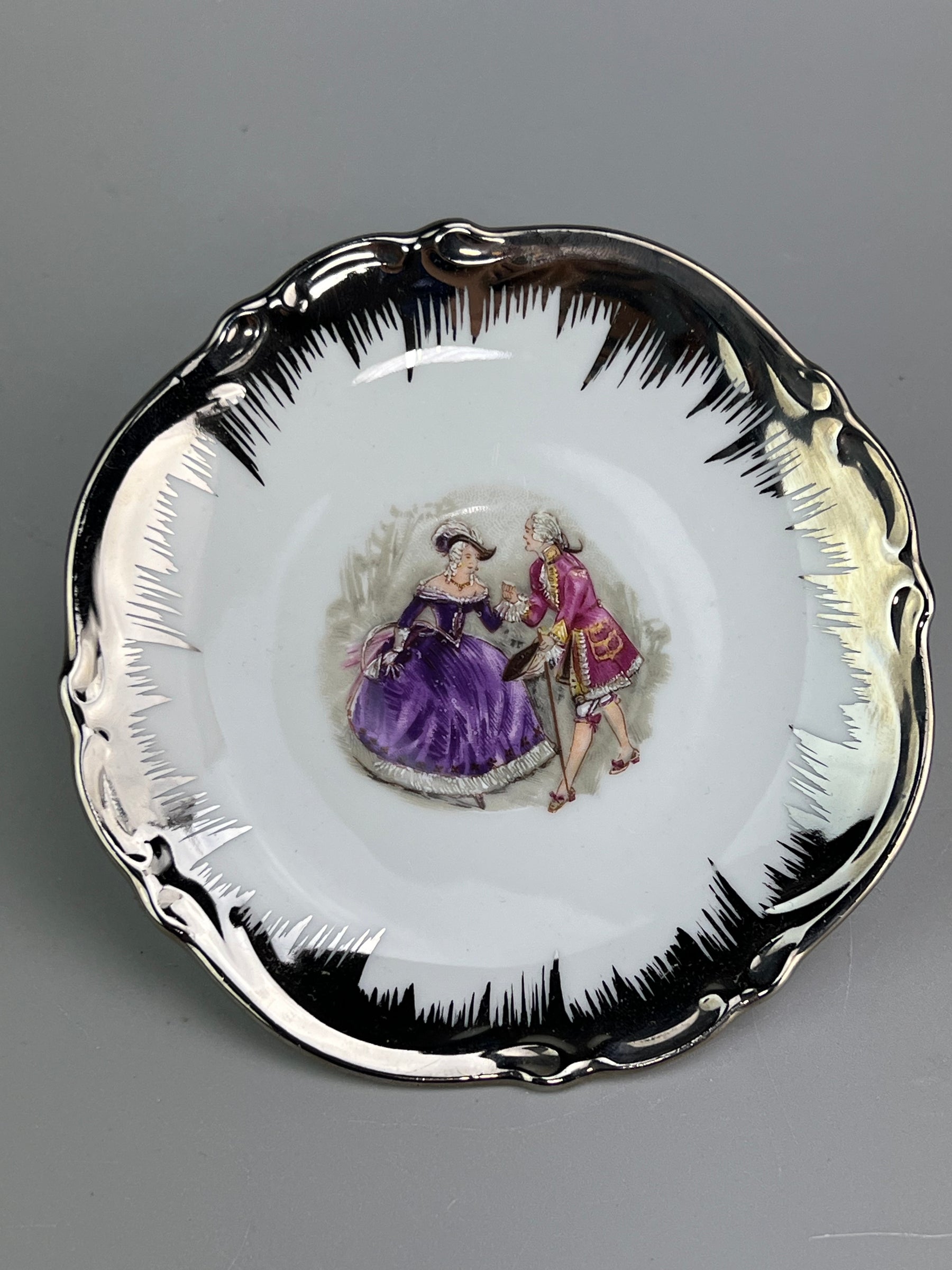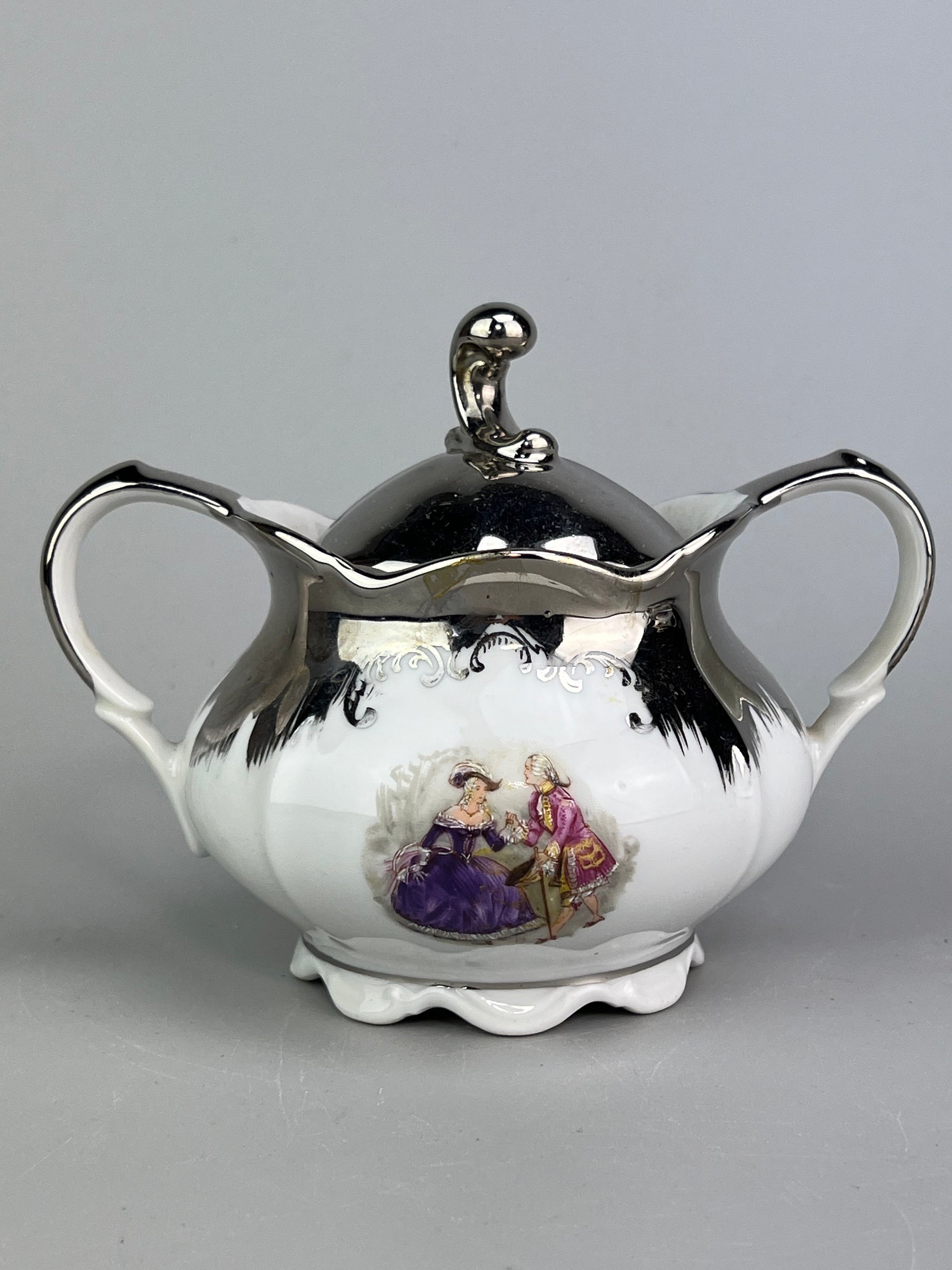 • Decorazione: Scene romantiche con personaggi in abiti d’epoca, bordi e manici con finitura argentata