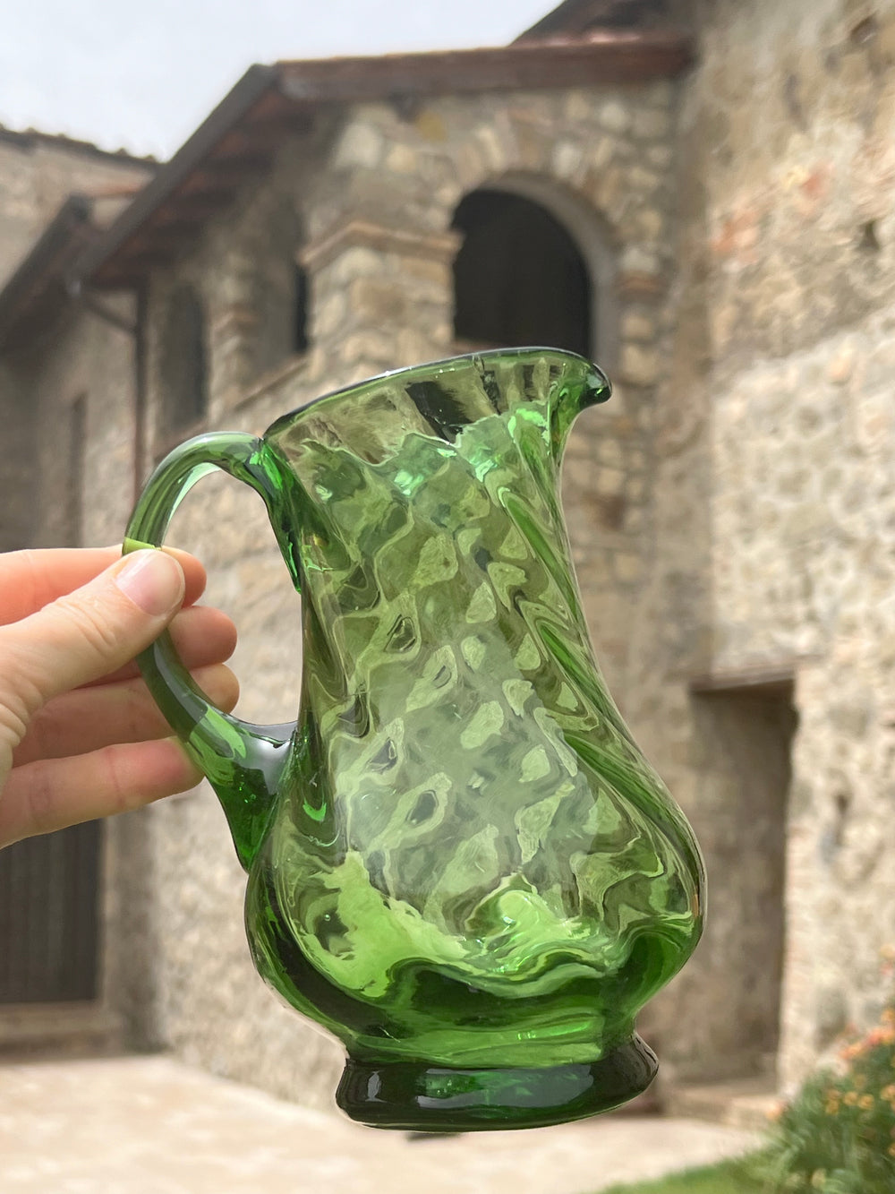 Deliziosa Brocca in vetro verde vintage.   Realizzata con cura artigianale, questa brocca presenta una bellissima texture ondulata che cattura e riflette la luce.  Perfetta per occasioni speciali o per un uso quotidiano, aggiunge un tocco di colore alla vostra tavola.