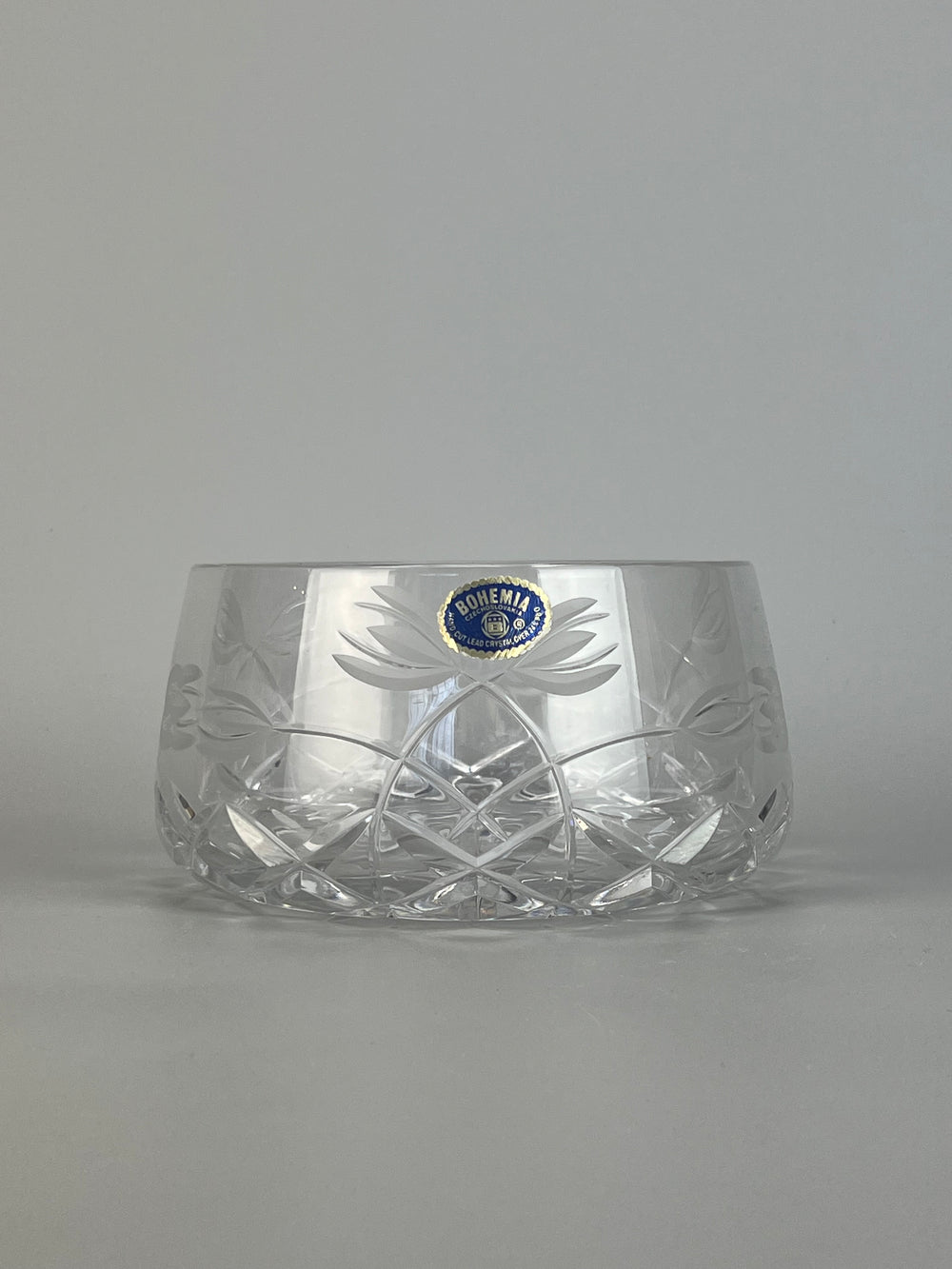 Splendido Centrotavola in Cristallo Bohemia, un materiale di alta qualità. Il decoro è intagliato a mano e presenta sulla base un motivo geometrico in contrasto con le linee morbide dei fiori.