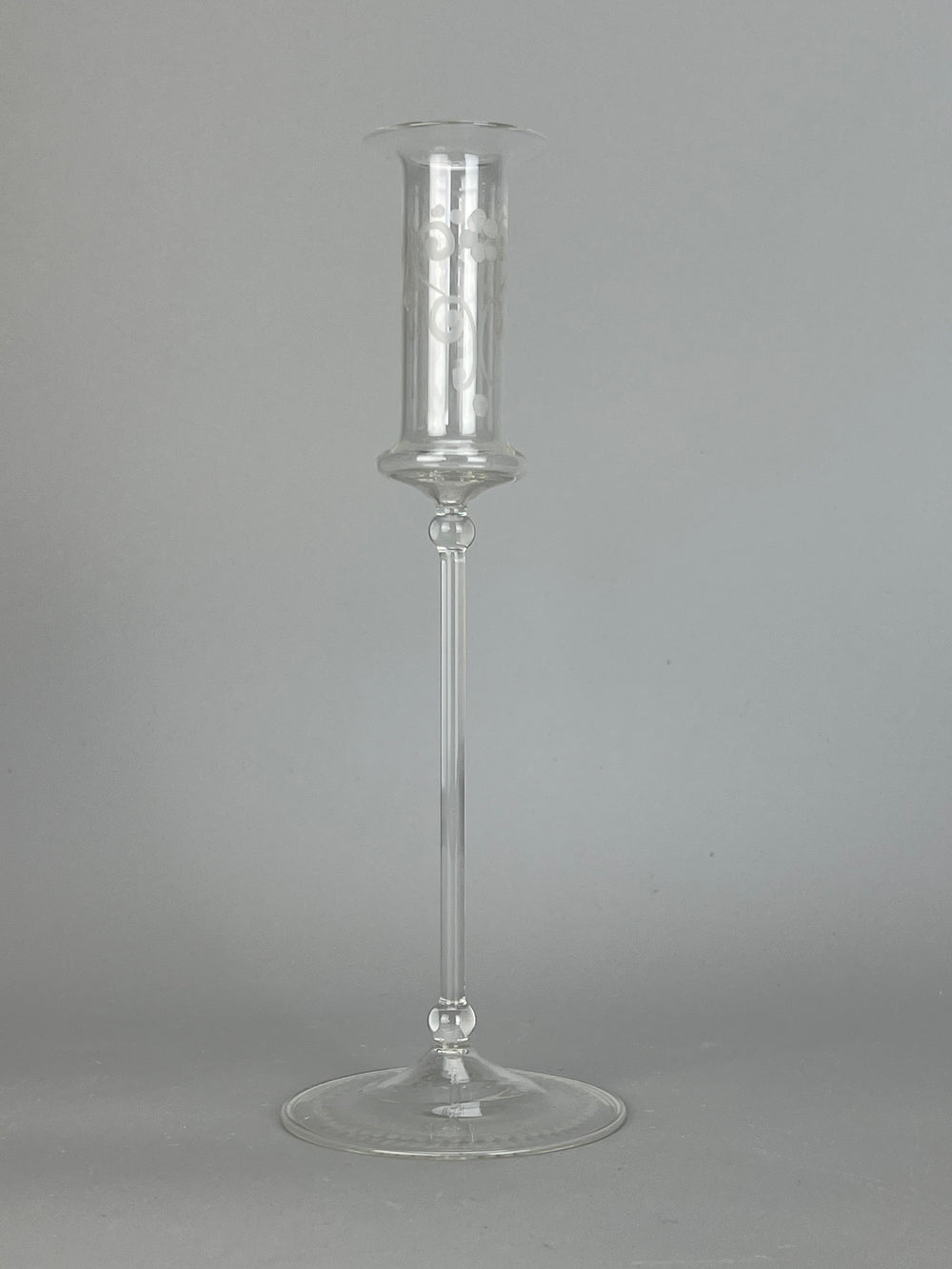 Candelabro in vetro soffiato realizzato artigianalmente e decorato con motivo a cerchio sulla base e un decoro floreale sulla parte superiore. Ideale per illuminare la casa con l'eleganza senza tempo.