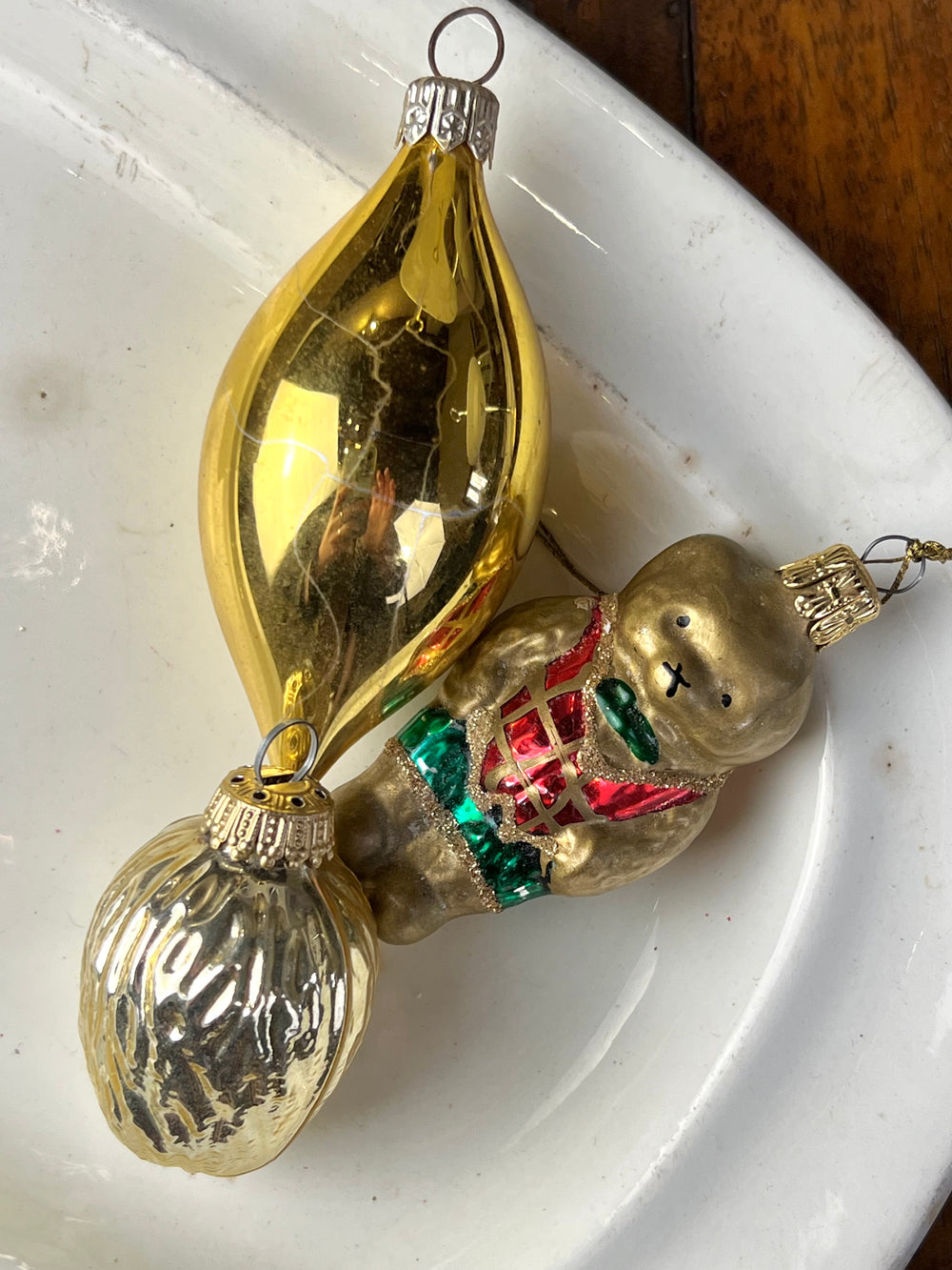 Set di dieci palline in vetro vintage dai toni dell'oro e del marrone. Pezzi unici, piani di storia ed incanto, pronti a brillare sul tuo albero.