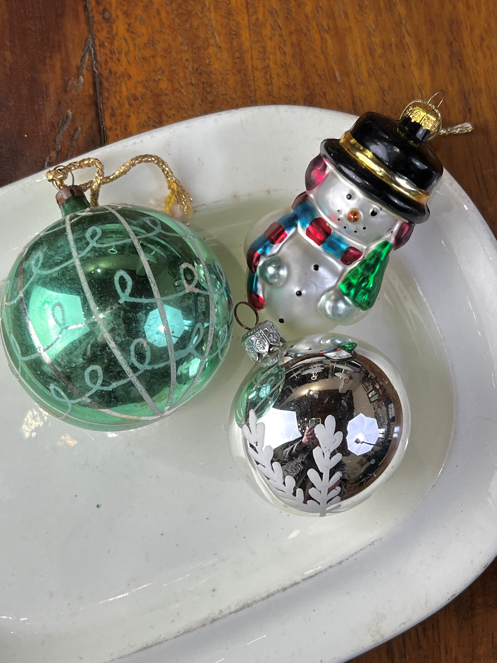 Set di dieci palline in vetro vintage dai toni dell'argento e del verde. Pezzi unici, piani di storia ed incanto, pronti a brillare sul tuo albero.