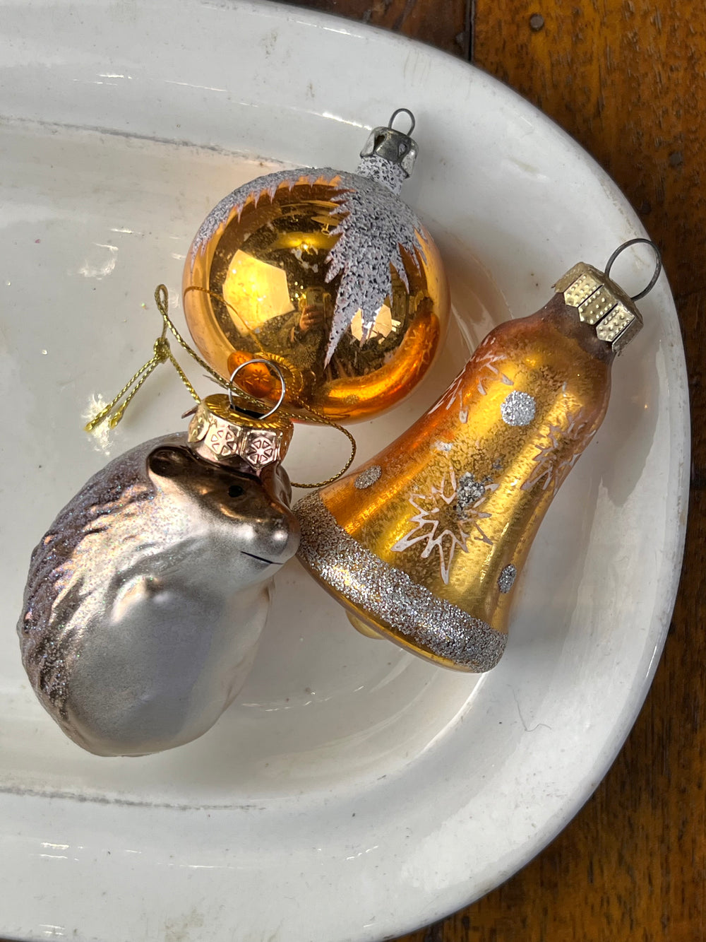 Set di dieci palline in vetro vintage dai toni dell'oro e del marrone. Pezzi unici, piani di storia ed incanto, pronti a brillare sul tuo albero.