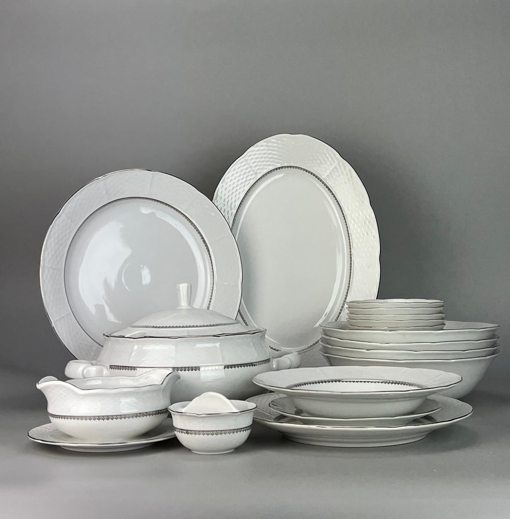 Elegante Servizio di piatti in porcellana Thun Czechoslovakia decorato con dettagli raffinati nei toni dell'argento e decoro a filigrana sul bordo che richiamo lo stile classico. E' composto da piatto piano, fondo, piattino da frutta, un vassoio tondo e uno ovale, una zuppiera, quattro ciotole, dodici ciotoline, una salsiera e un set per condimento.